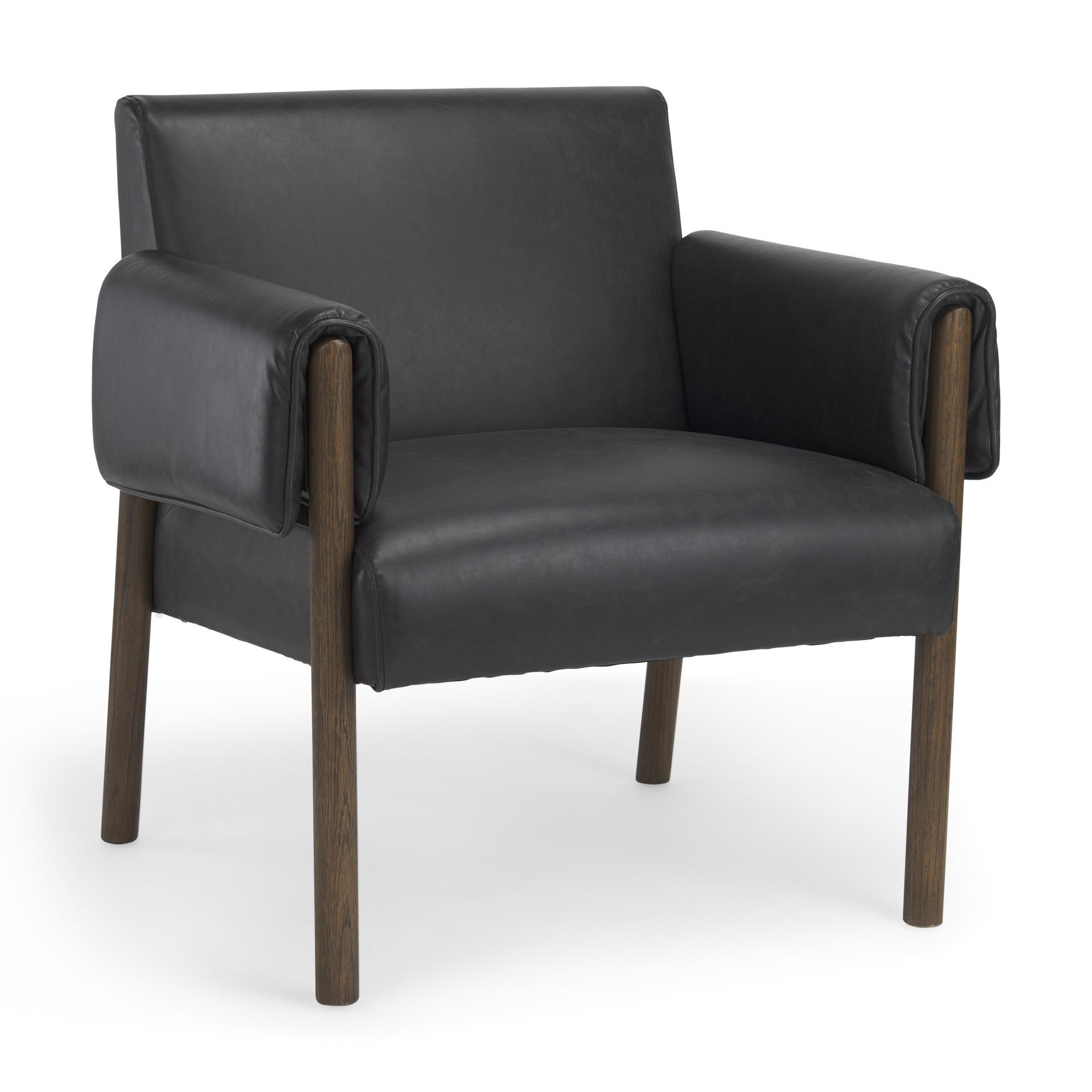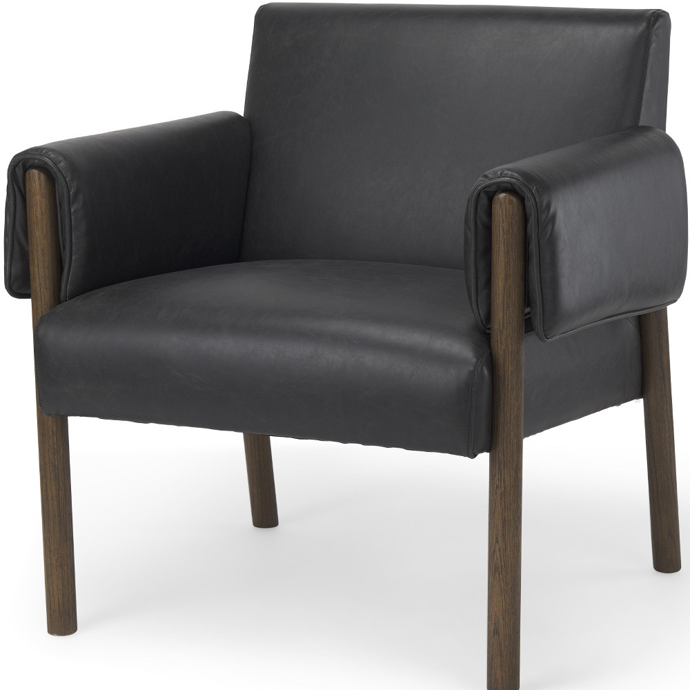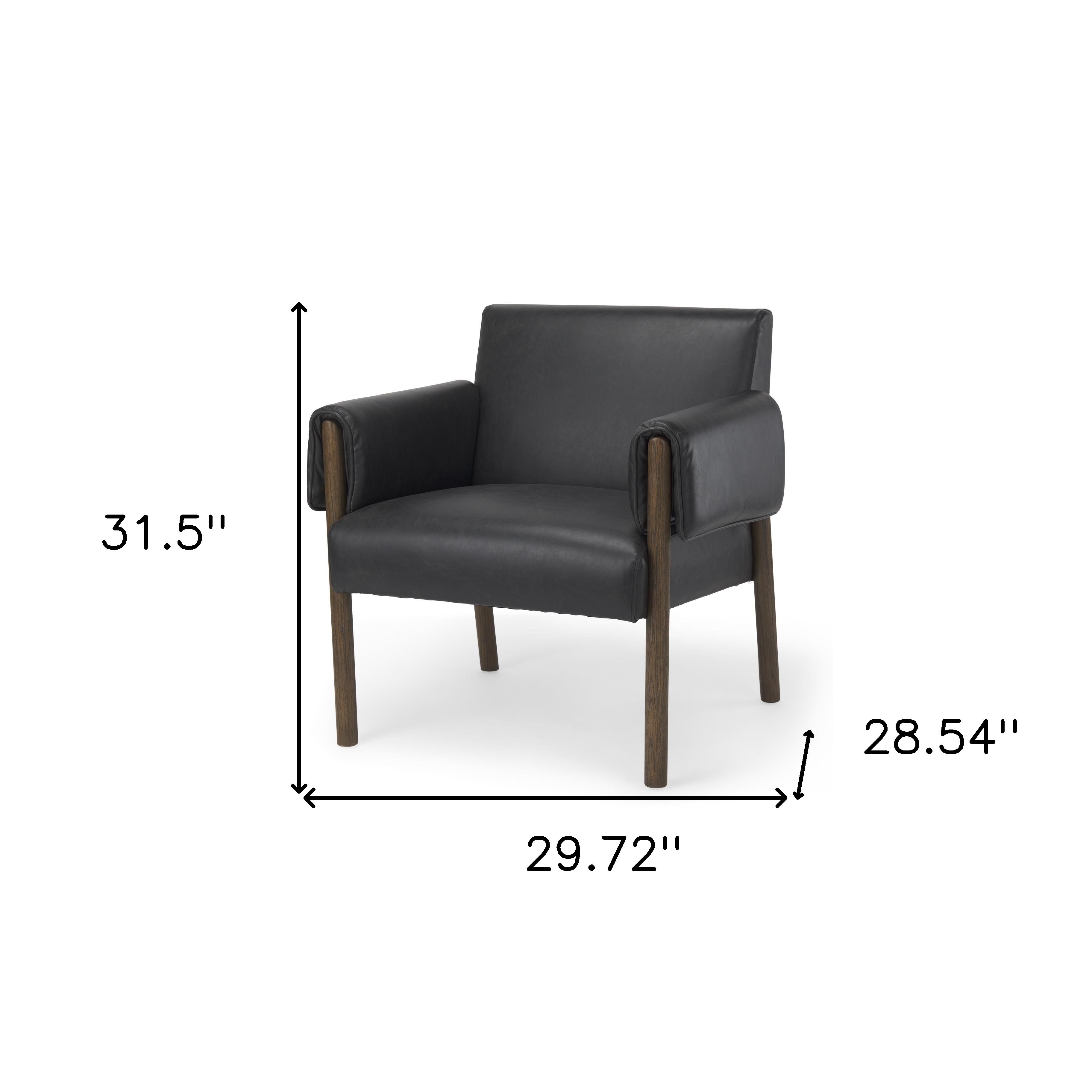 This 30-inch black and dark brown faux leather and solid wood arm chair will add a beautiful decorative accent to your decor. This sturdy faux leather arm chair comes in black to give your space just the right look. Giving the chair stability and structure, the inner frame is constructed with high quality solid wood, includes comfy armrests, and features a fixed back that comes complete with soft and comfortable cushioning. 31.50-inch h x 29.72-inch w x 28.54-inch d.