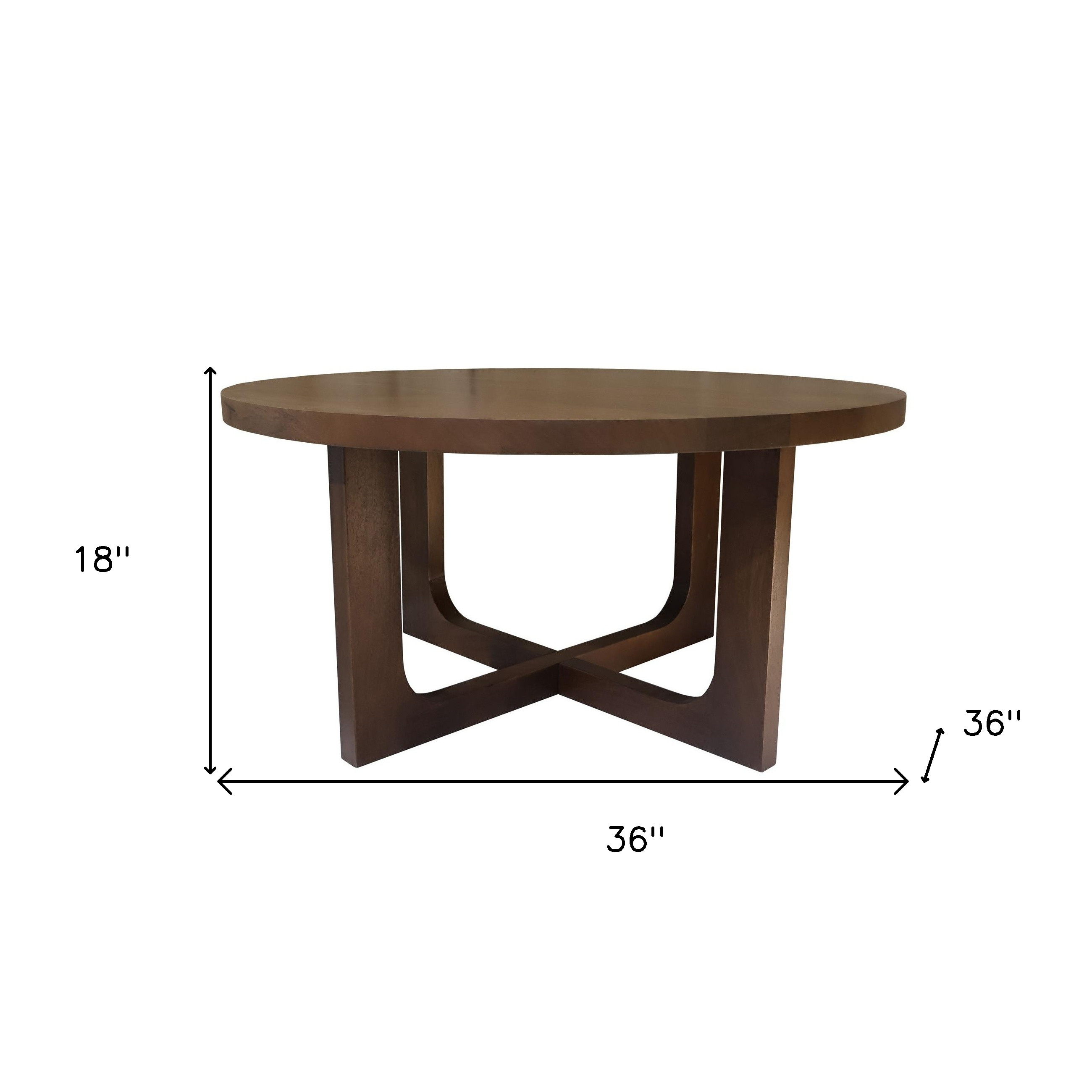 This stylish 36-inch brown solid wood round cross legs coffee table is sure to inspire compliments no matter where it sits. This table features quality construction from solid wood and an updated monotone color scheme with brown as the main color on both the top and the base. If you're looking for something that can fit into a living area, bedroom, or office, this coffee table is for you. 18.00-inch h x 36.00-inch w x 36.00-inch d.