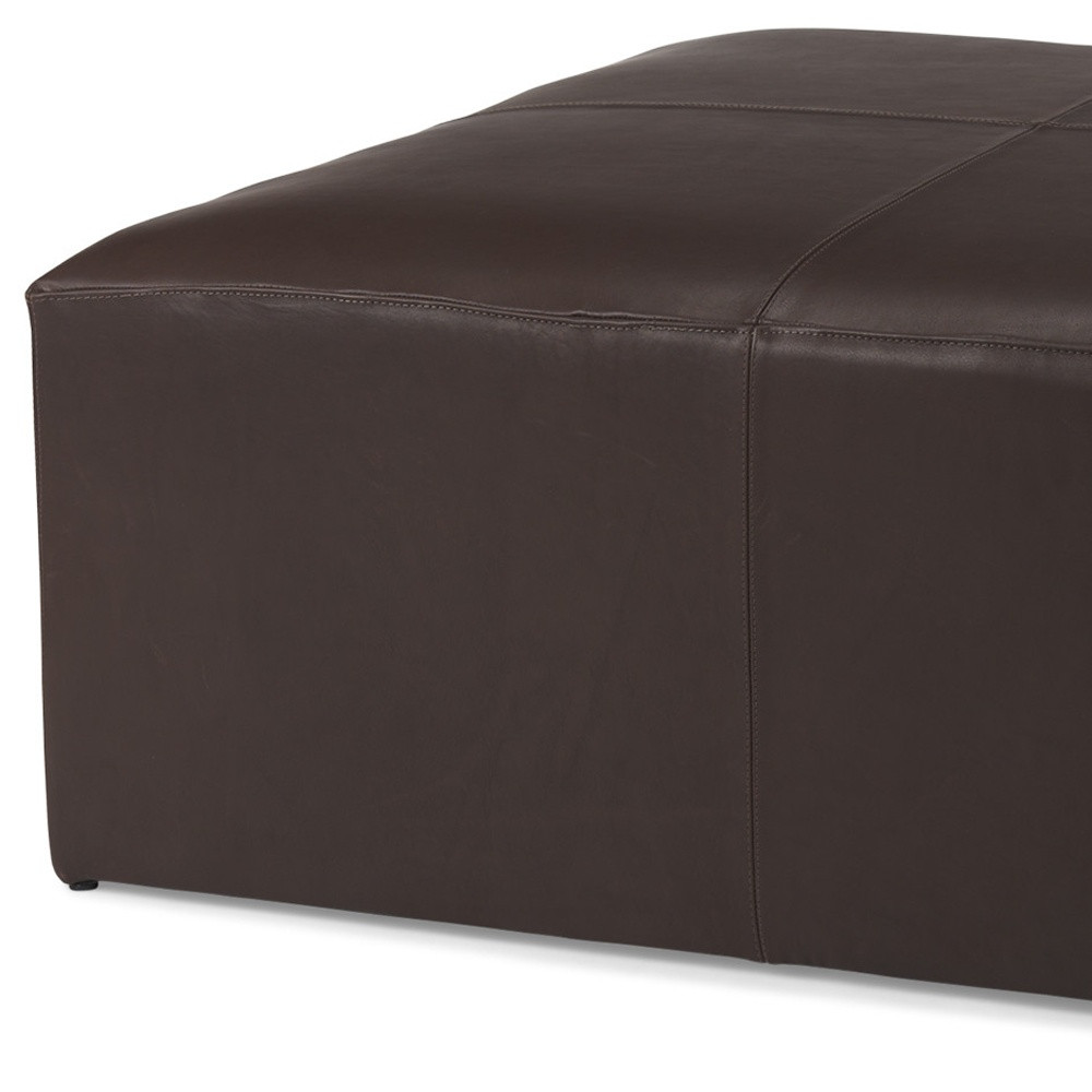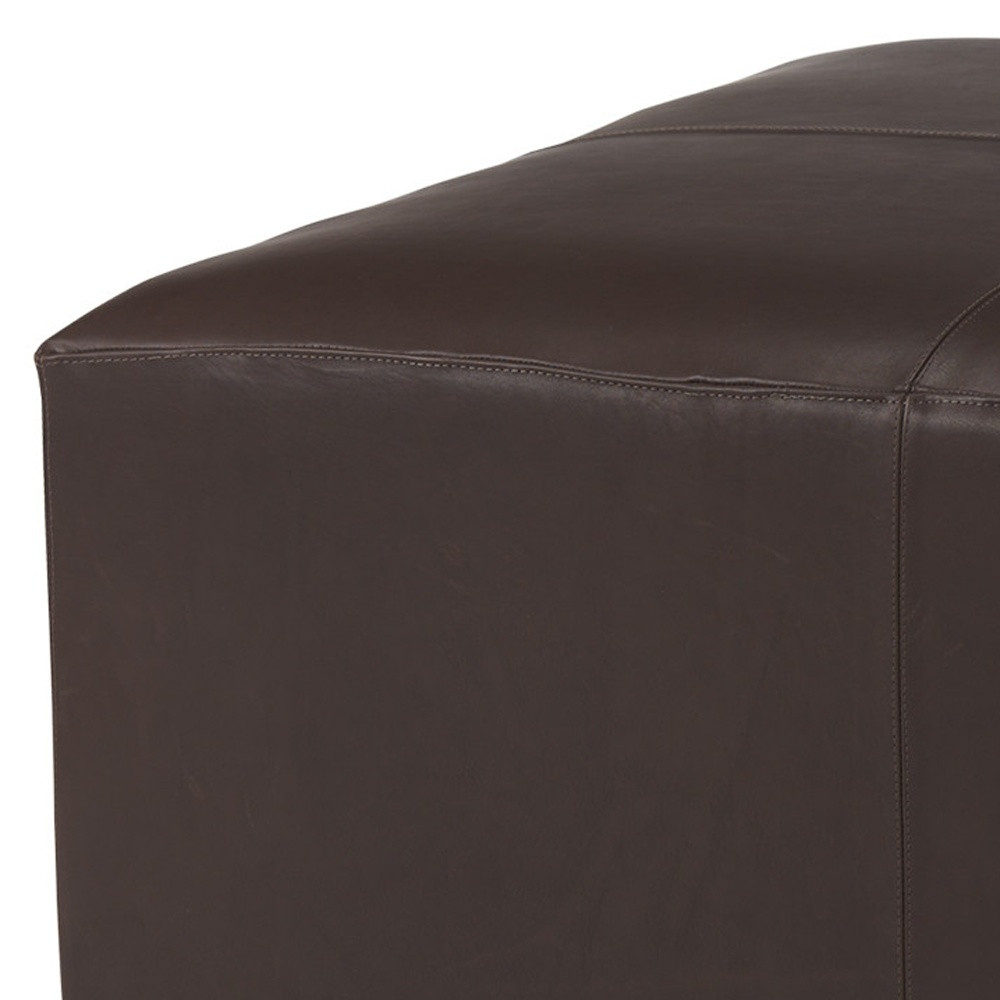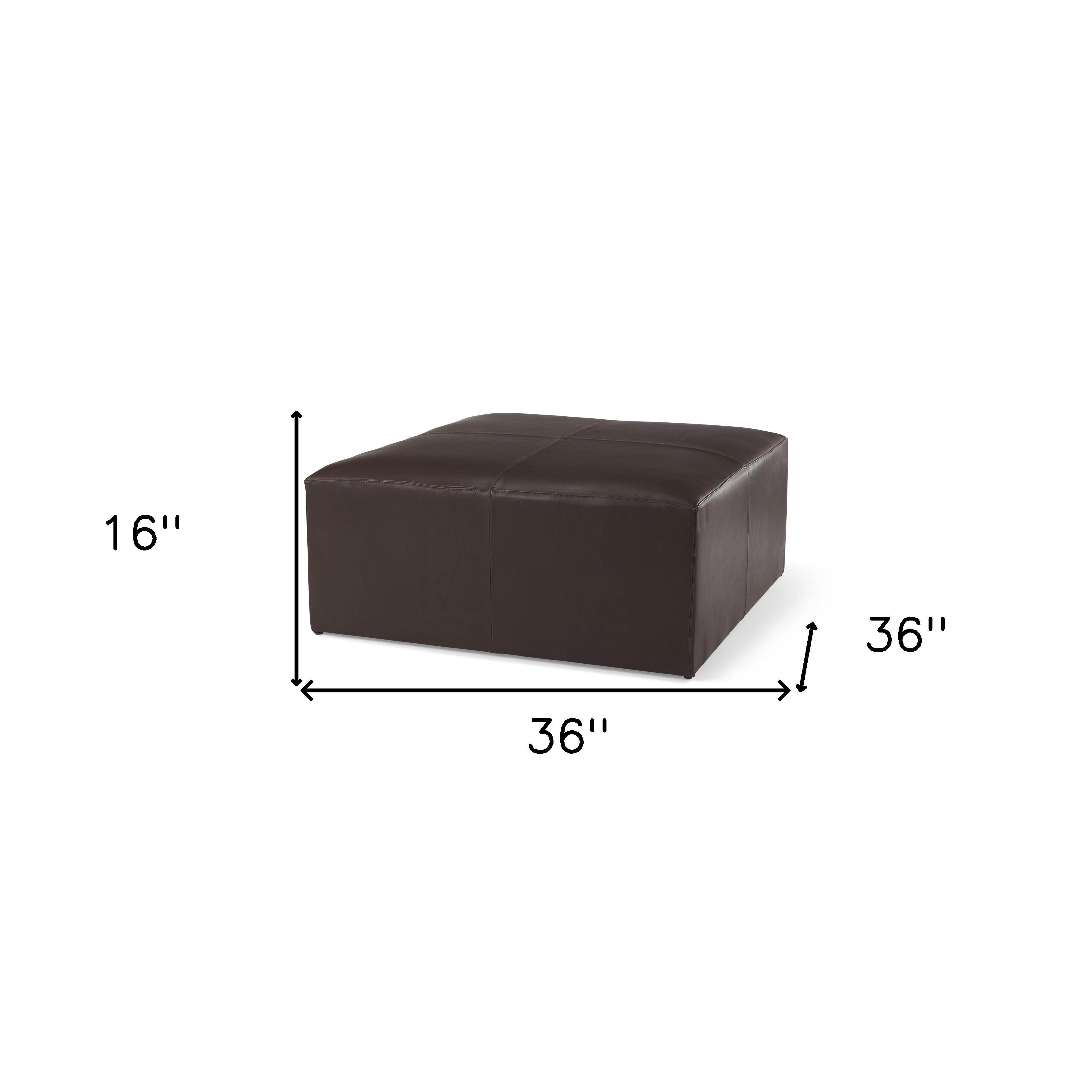 Practicality and fashion mix together with this handy 36-inch brown genuine leather ottoman. Fully upholstered in top grain leather, this square piece enhances the modern aesthetic of any room. Its rich brown color adds warmth while providing a luxurious feel. Versatile in nature, it serves as additional seating or a stylish footrest. This ottoman's sturdy construction ensures lasting durability, making it a valuable addition to your home decor. Elevate your living space with this stylish and functional accent piece. 16-inch h x 36-inch w x 36-inch d.