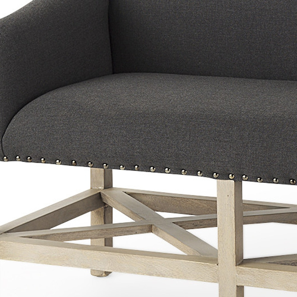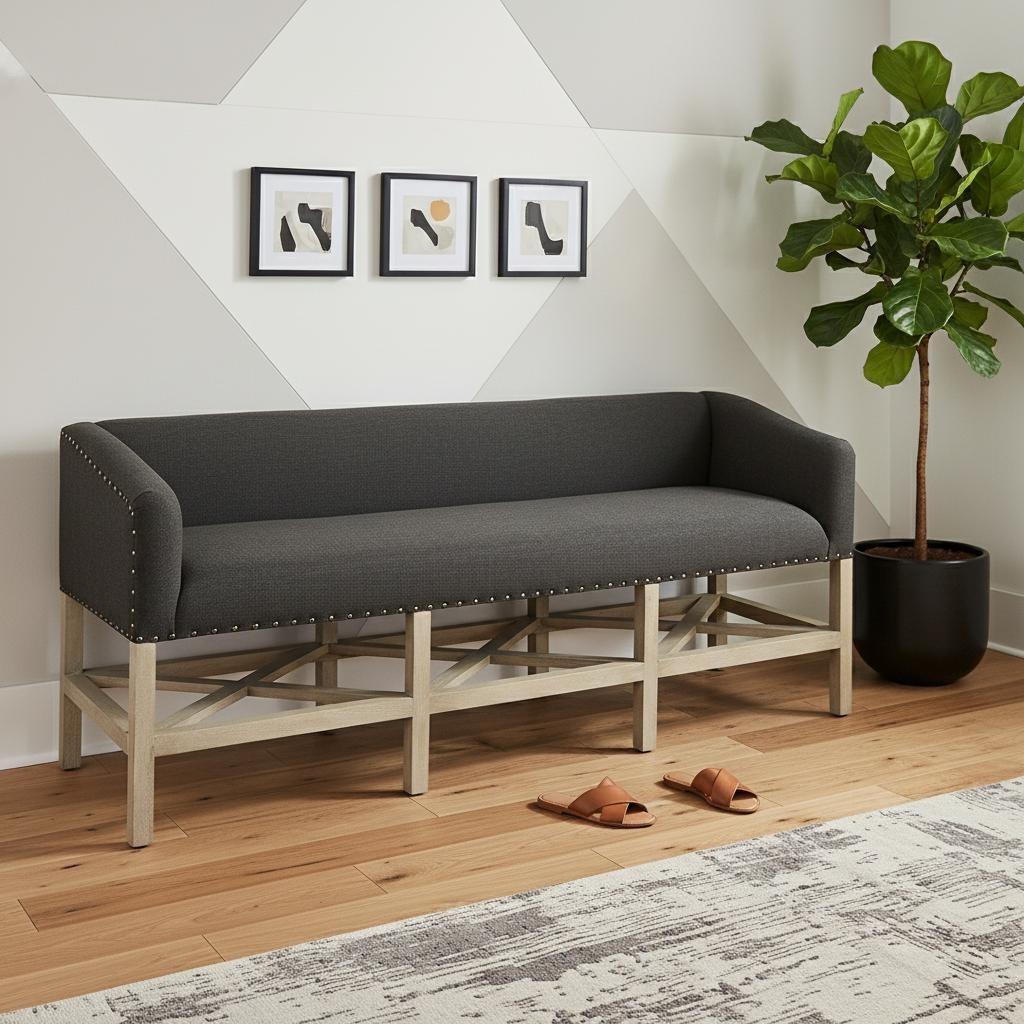Practicality and fashion mix together with this handy 60-inch gray and brown 100% polyester and solid wood upholstered bench. The gray upholstery top of this bench is a nice contrast to the high quality, brown solid wood of the base. Ideal for entrance foyer, hallway, or laundry room. This bench is a great place store your keys, put on your shoes, or be a catchall on your way in or out. Easy to blend into most any room, a bench is a way to add a good looking accent to your space that can also be practical and useful. 25.5-inch h x 60-inch w x 19-inch d.