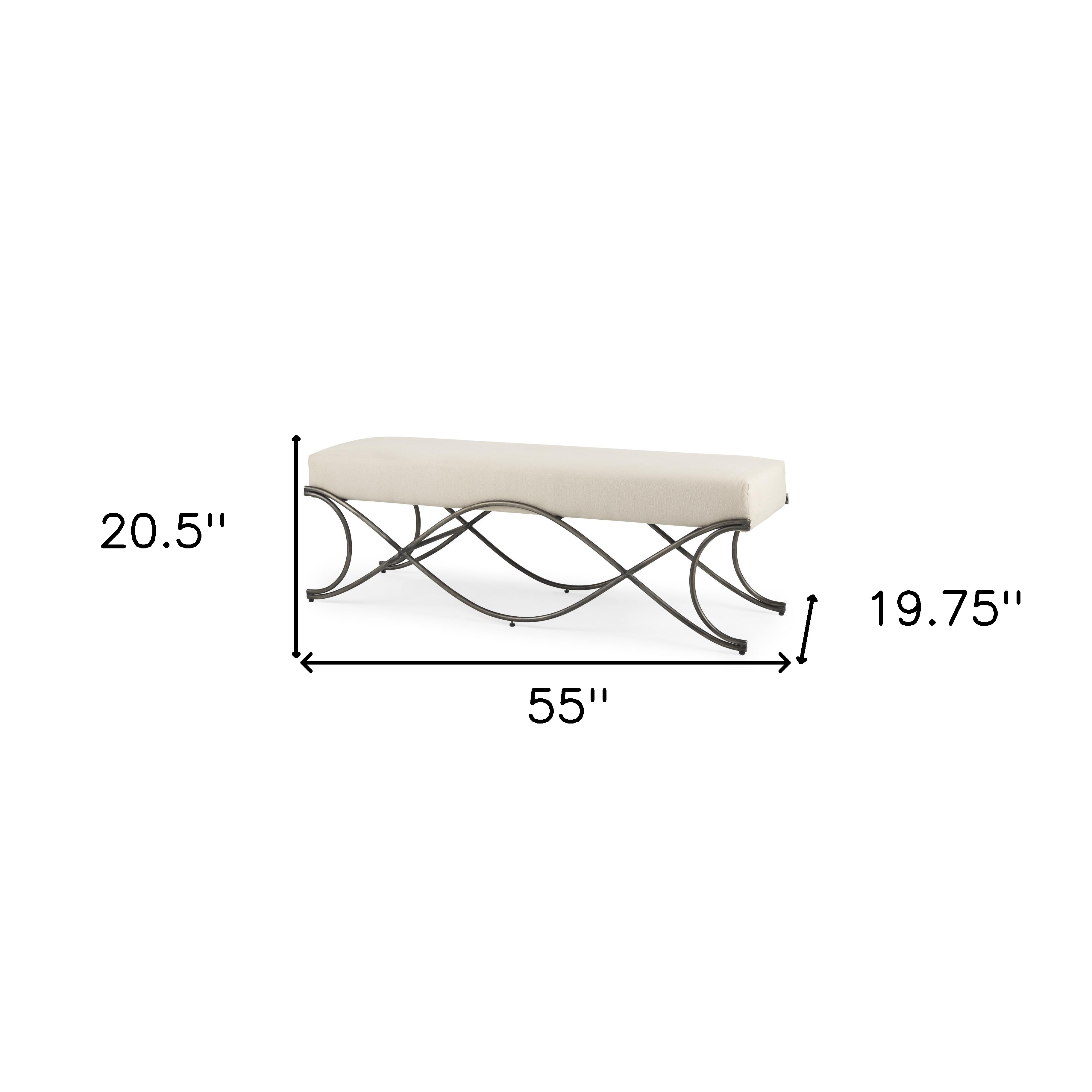 Optimize your space and add some charm to your room with the 55-inch cream and nickel fabric and metal upholstered bench. A nickel metal frame is finished off with a cream upholstery seat that is the epitome of quality construction and design. Expertly upholstered with padding in a soft solid color polyester, this bench is as comfortable as it is good looking. Ideal for entrance foyer, hallway, or laundry room. This bench is a great place store your keys, put on your shoes, or be a catchall on your way in or out. Easy to blend into most any room, a bench is a way to add a good looking accent to your space that can also be practical and useful. 20.5-inch h x 55-inch w x 19.75-inch d.
