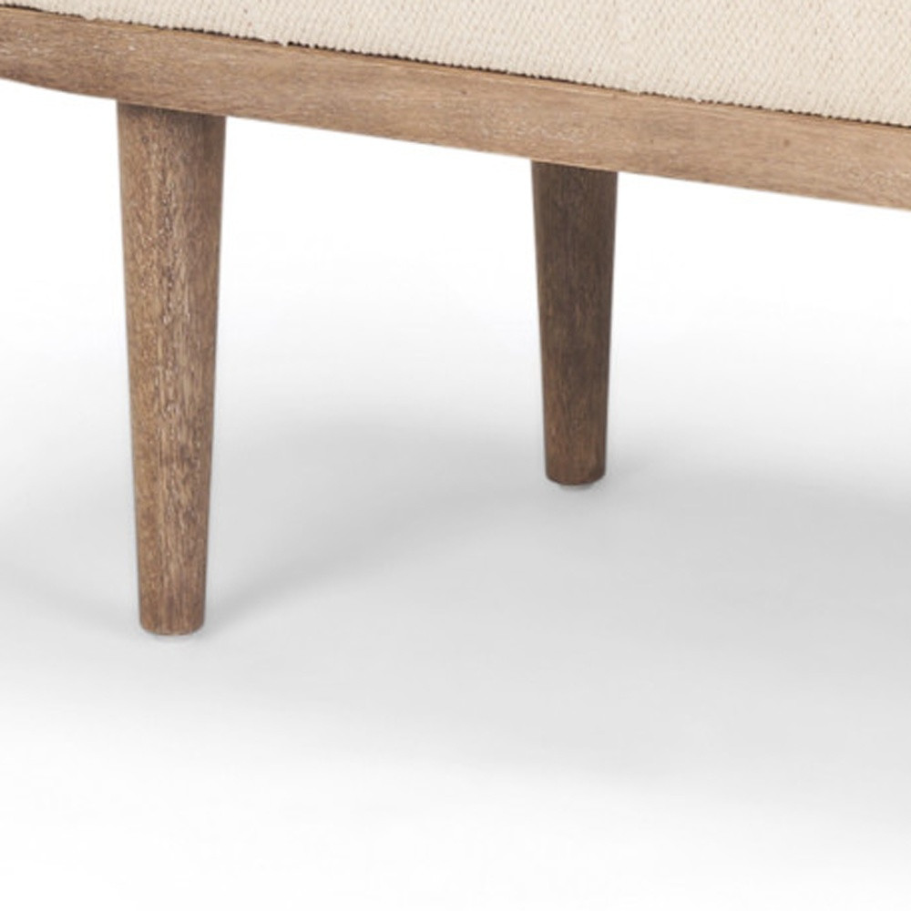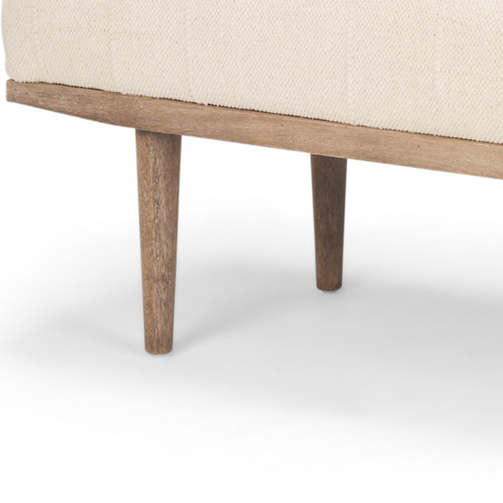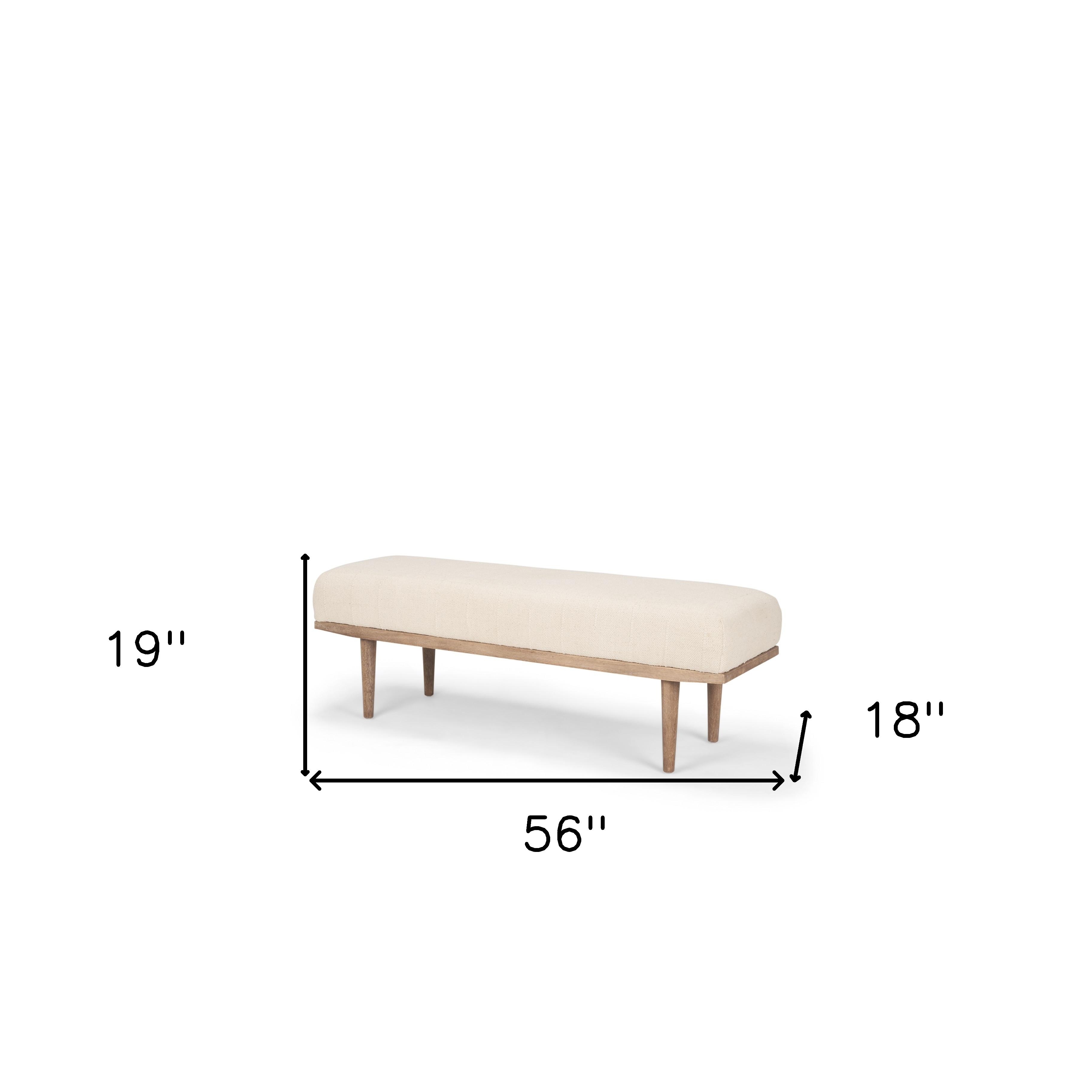 Distinctive in style the 56-inch beige and brown cotton and solid wood upholstered bench radiates a versatile charm. The beige upholstery top of this bench is a nice contrast to the high quality, brown solid wood of the base. Expertly upholstered with padding in a soft solid color 100% cotton, this bench is as comfortable as it is good looking. Ideal for entrance foyer, hallway, or laundry room. This bench is a great place store your keys, put on your shoes, or be a catchall on your way in or out. Easy to blend into most any room, a bench is a way to add a good looking accent to your space that can also be practical and useful. 19-inch h x 56-inch w x 18-inch d.