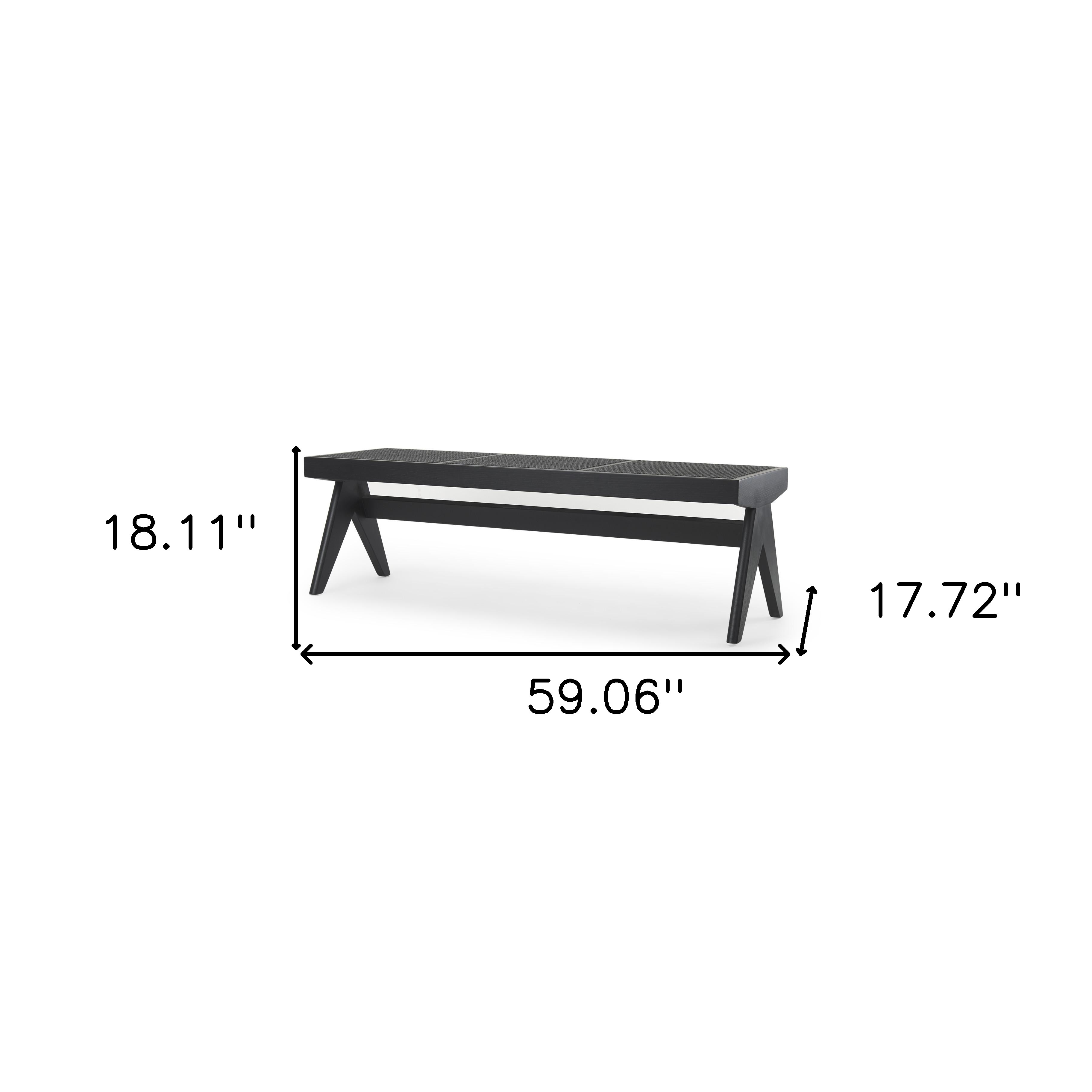 Optimize your space and add some charm to your room with the 59-inch black solid wood and cane dining bench. A solid black solid wood frame is finished off with a matching black cane seat, giving this bench a chic monotone look. Add this bench to your kitchen or dining room for convenient seating at the table. Benches don't have to be unsightly. Increase your seating and the fashion quotient of your room all at the same time with this hard wearing, versatile, and good looking bench. 18.11-inch h x 59.06-inch w x 17.72-inch d.