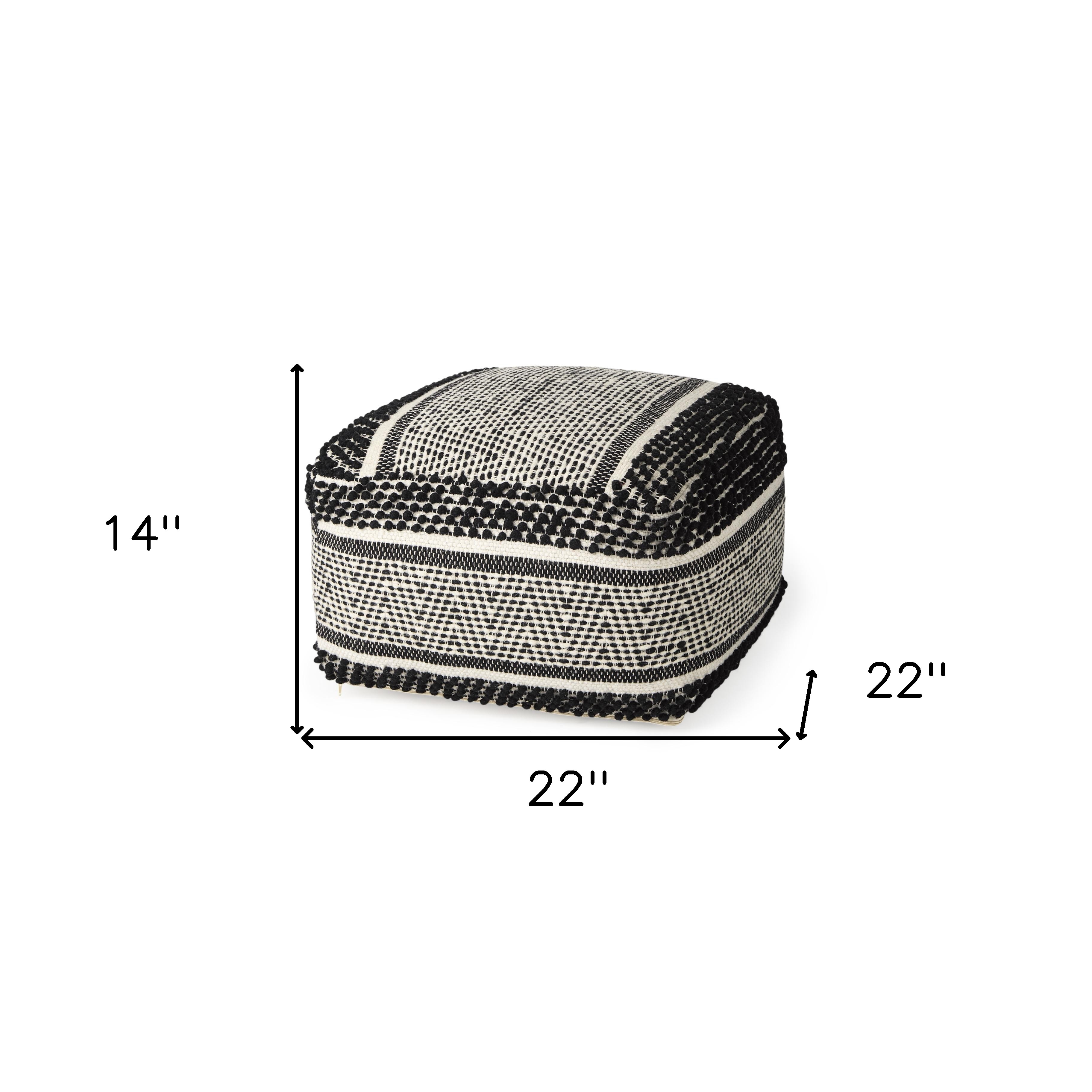 Get ready to relax with this 22-inch black and white cotton and wool geometric pouf ottoman. Add chic style to your space with this fun pouf that not only looks cool but can be a great foot rest or extra seat when needed. Expertly woven from soft cotton and wool in geometric stripes and dots patterning, this ottoman is as comfortable as it is good looking. Ottomans are multi-functional additions to your space that add fashion and practical value. 14.00-inch h x 22.00-inch w x 22.00-inch d.