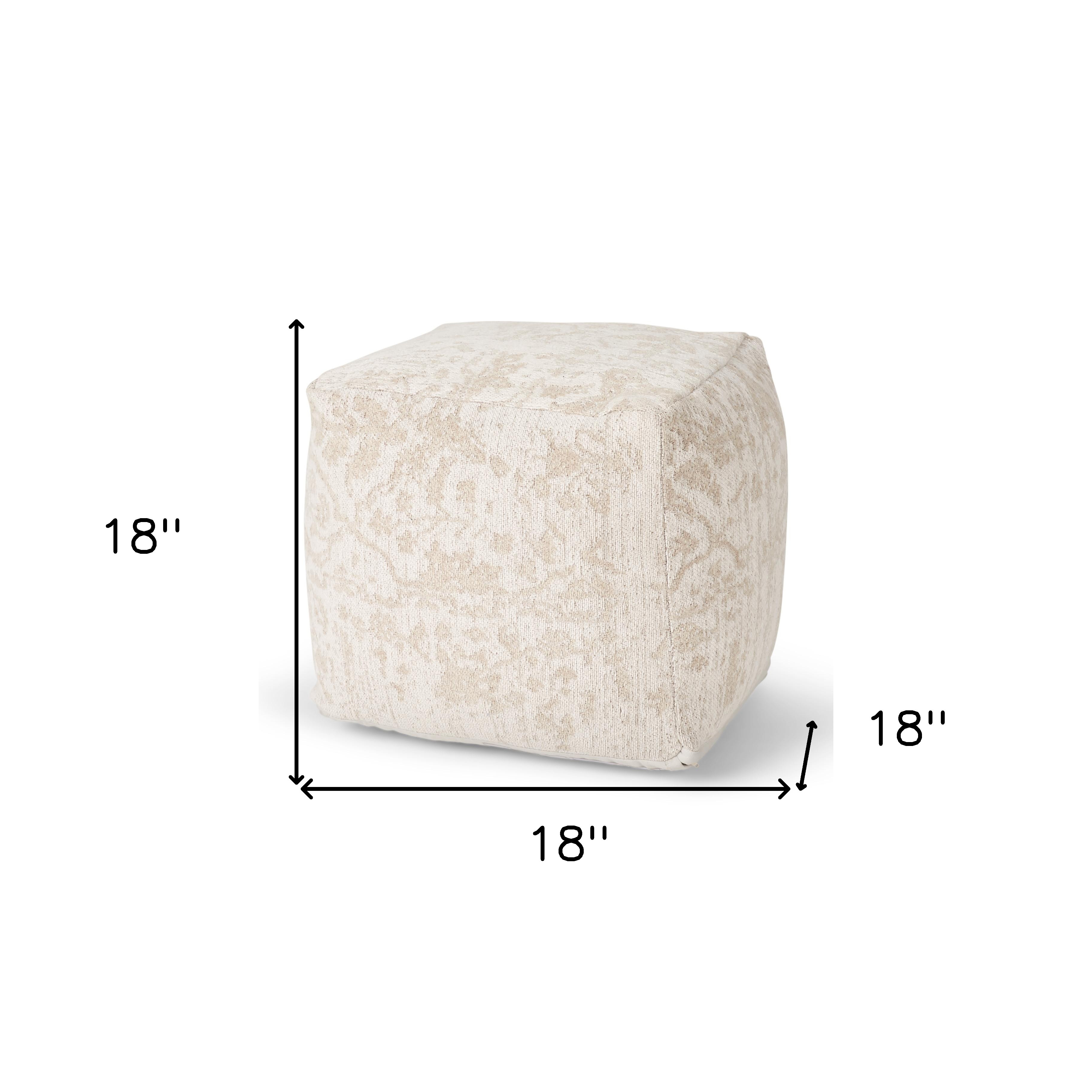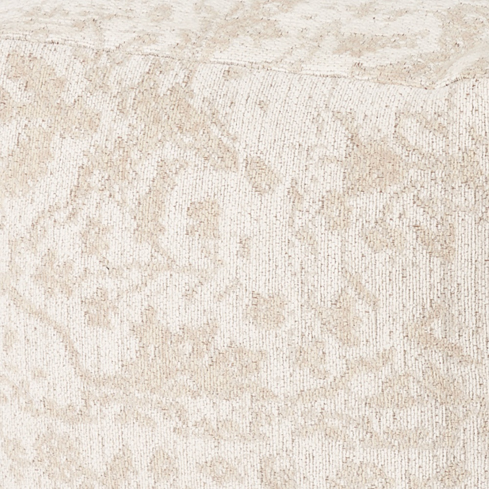 Get ready to relax with this 18-inch cream and beige fabric damask pouf ottoman. Add chic style to your space with this fun pouf that not only looks cool but can be a great foot rest or extra seat when needed. Expertly upholstered in a soft chenille with a sophisticated damask jacquard patterning, this ottoman is as comfortable as it is good looking. Ottomans are multi-functional additions to your space that add fashion and practical value. 18.00-inch h x 18.00-inch w x 18.00-inch d.