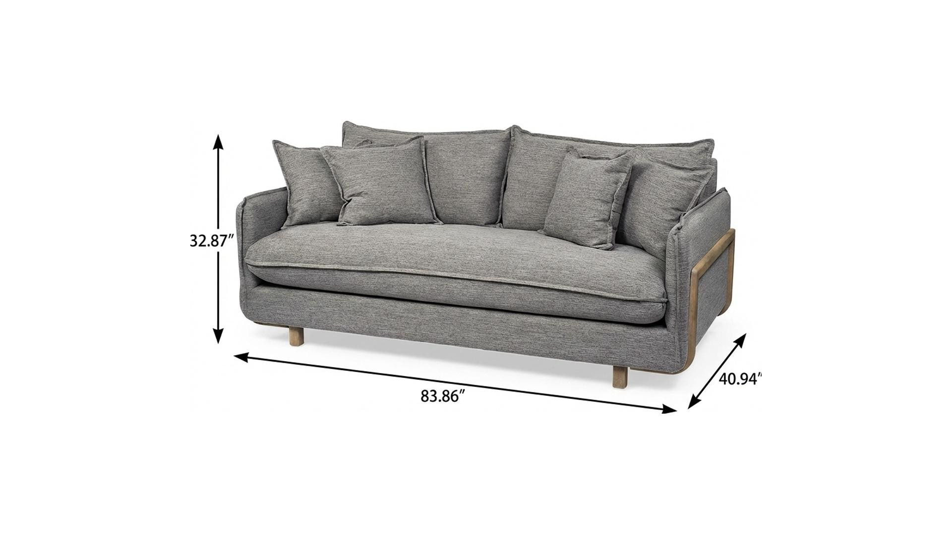Designed for comfort and good looks, this 84-inch gray fabric sofa with brown legs is a great option to anchor your space. Web suspension construction gives this piece strong support and makes it comfortable to sit even for long periods of time. Removable seat cushions make this sofa easy to manage. Pillow top arms offer a comfy place to rest. Brown solid wood legs effortlessly elevate the room and add a touch of contemporary design. Built to last, this sofa will be a great centerpiece for your room. 32.87-inch h x 83.86-inch w x 40.94-inch d.