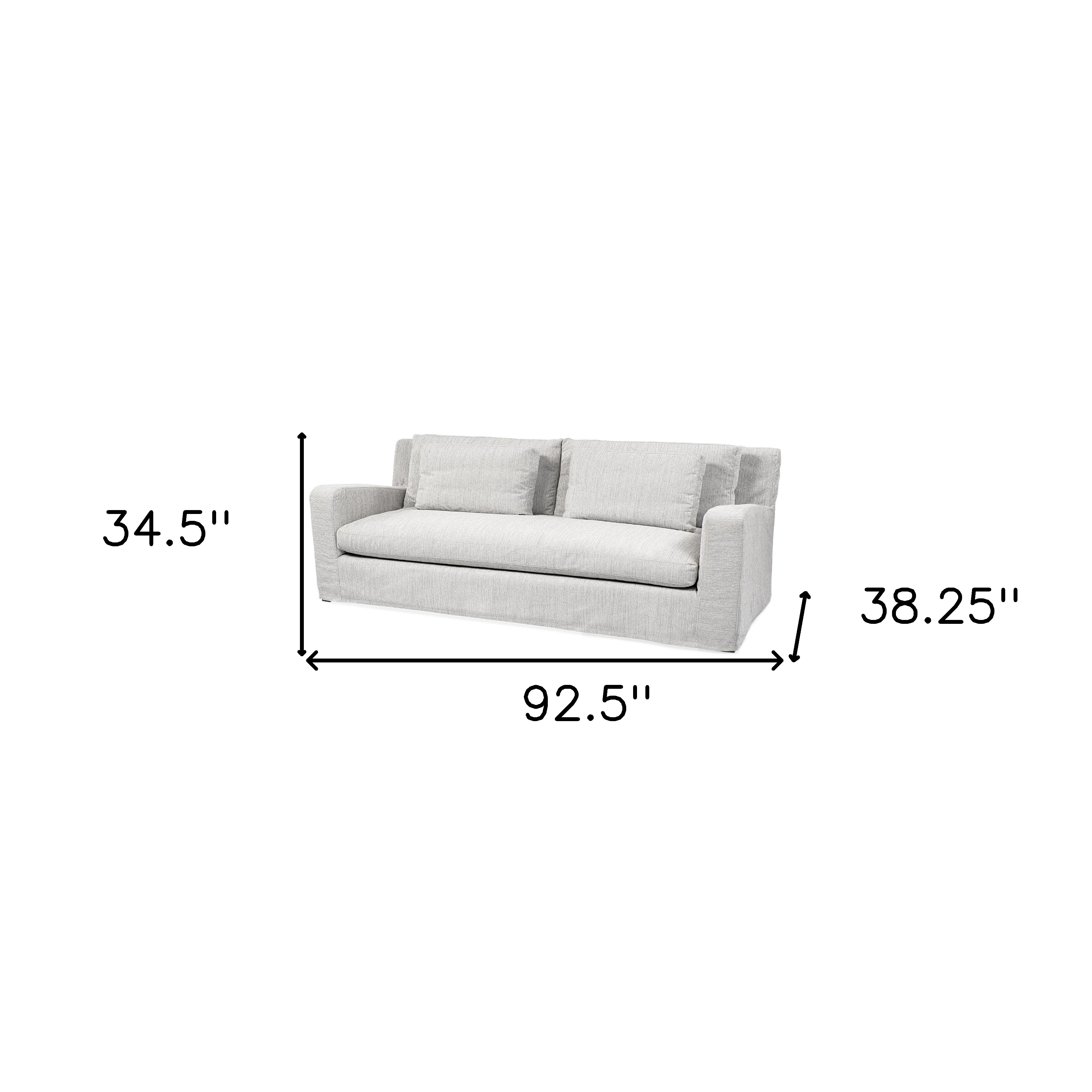 Designed for comfort and good looks, this 93-inch light gray fabric sofa and toss pillows is a great option to anchor your space. The slipcovered sofa features cushioned back and extra toss pillows that make your lounging luxuriously comfortable and adds an elegant appeal to your space. Web suspension construction gives this piece strong support and makes it comfortable to sit even for long periods of time. Track arms offer a comfy place to rest. Built to last, this sofa will be a great centerpiece for your room. 34.5-inch h x 92.5-inch w x 38.25-inch d.