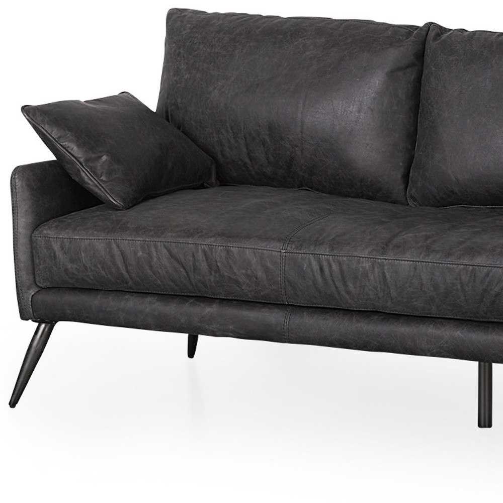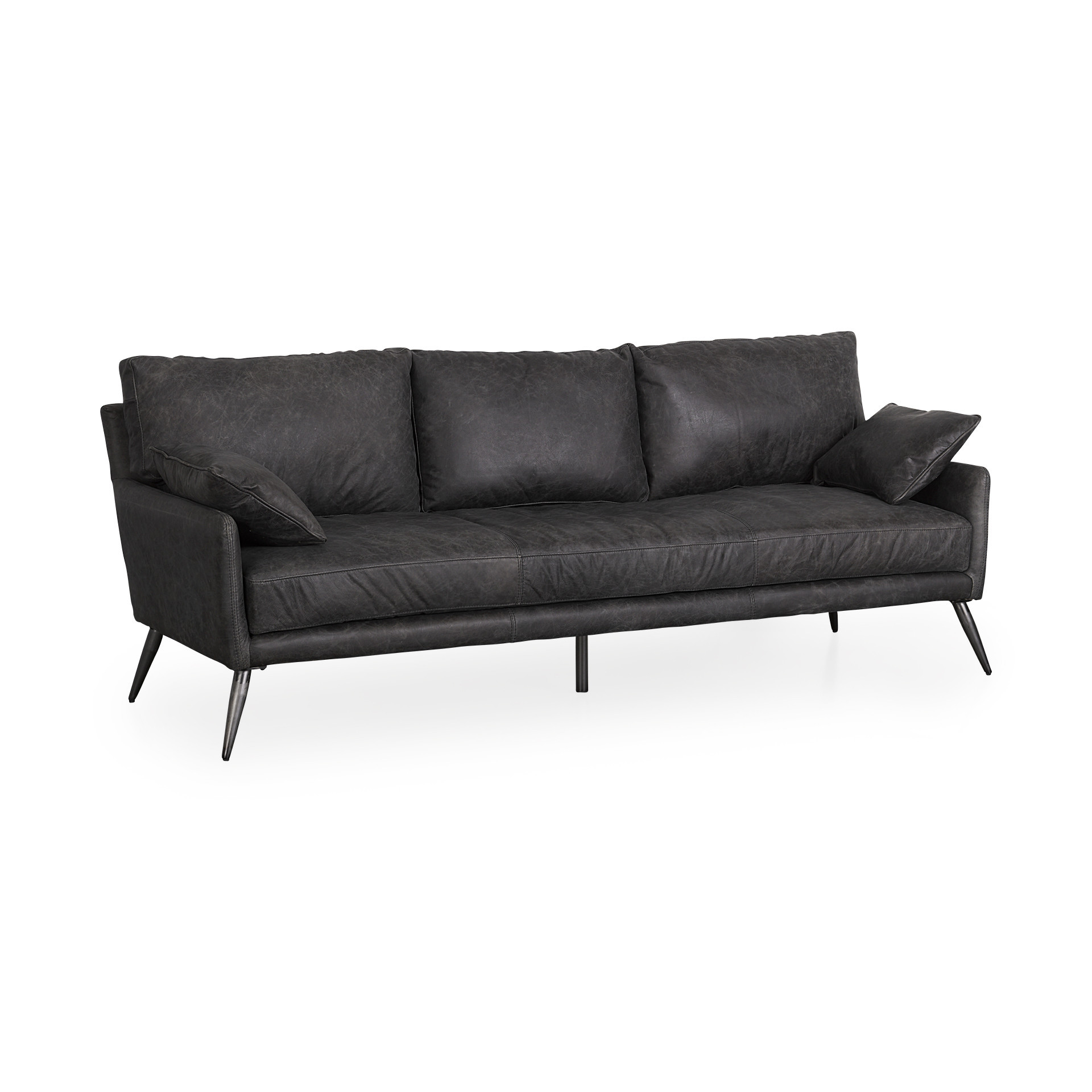 An interior designer's dream, this buttery soft high grade leather 82-inch black leather sofa with toss pillows will bring just the right touch to your space. The premium leather used makes your lounging luxuriously comfortable and adds an elegant appeal to your space. Web suspension construction gives this piece strong support and makes it comfortable to sit even for long periods of time. Flared arms offer a comfy place to rest. Gray metal legs effortlessly elevate the room and add a touch of contemporary design. Built to last, this sofa will be a great centerpiece for your room. 32.00-inch h x 82.00-inch w x 33.00-inch d.
