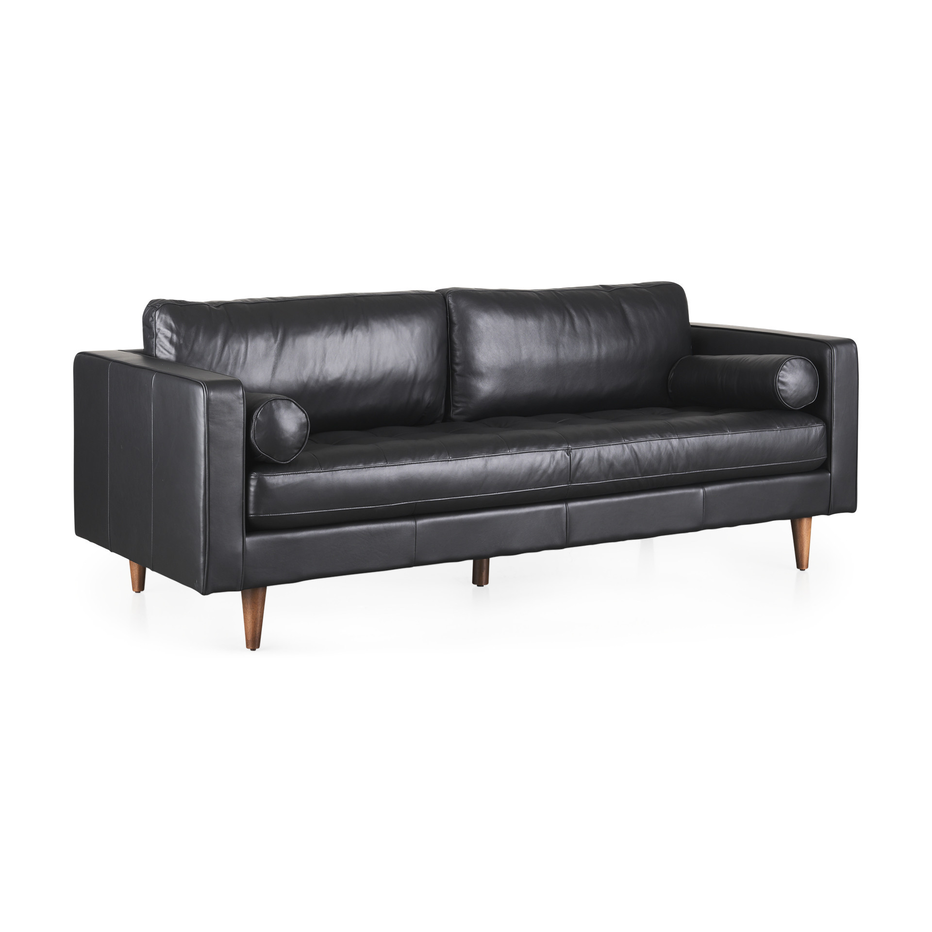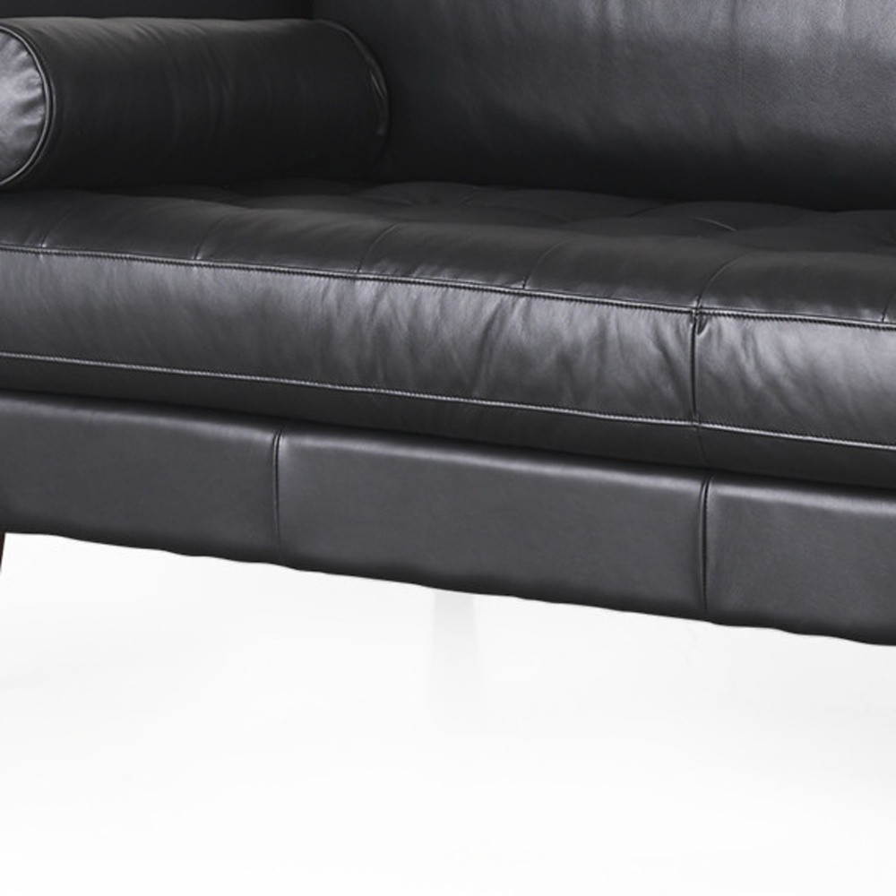 An interior designer's dream, this buttery soft high grade leather 88-inch black leather sofa and toss pillows with brown legs will bring just the right touch to your space. The premium leather used makes your lounging luxuriously comfortable and adds an elegant appeal to your space. Web suspension construction gives this piece strong support and makes it comfortable to sit even for long periods of time. Removable seat cushions make this sofa easy to manage. Square arms offer a comfy place to rest. Brown solid wood legs effortlessly elevate the room and add a touch of contemporary design. Built to last, this sofa will be a great centerpiece for your room. 34-inch h x 88-inch w x 38-inch d.