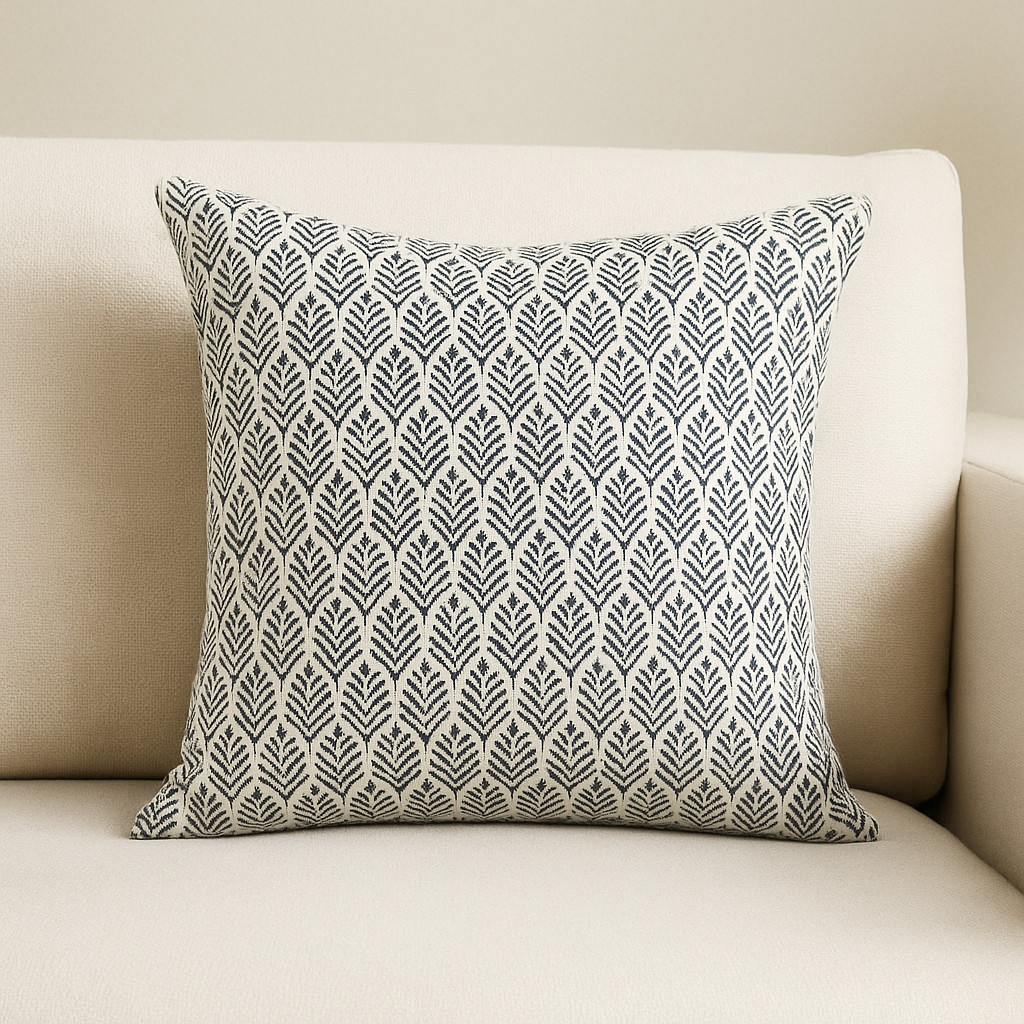 Bring a bit of fashion and zip to your space with this eye-catching and comfy 22-inch cream and indigo botanical linen throw pillow cover with embroidery. This soft and durable decorative pillow cover is expertly made of high grade, long lasting linen in a cream and indigo coloration. Embroidered decorative accents add some high end and hand-crafted textural designer touches. Decorative pillow covers are a great way to change up the look and feel of your space easily and quickly. Combine with your own fill or insert to add decoration and dimension to your favorite chair, accent your sofa, or to use as part of your bed ensemble. 22-inch h x 22-inch w x 0.2-inch d.