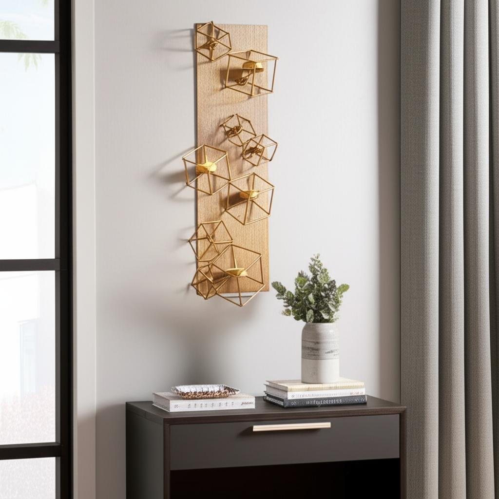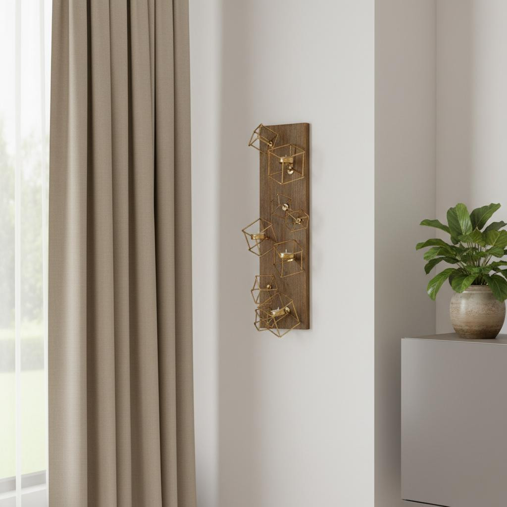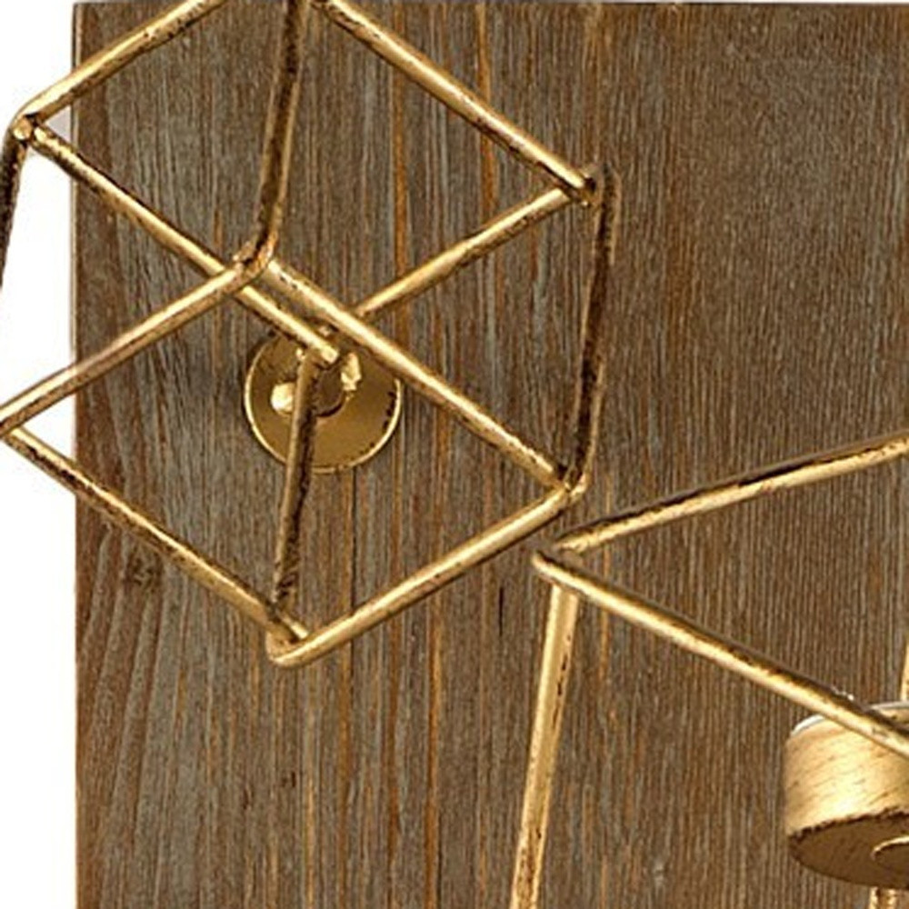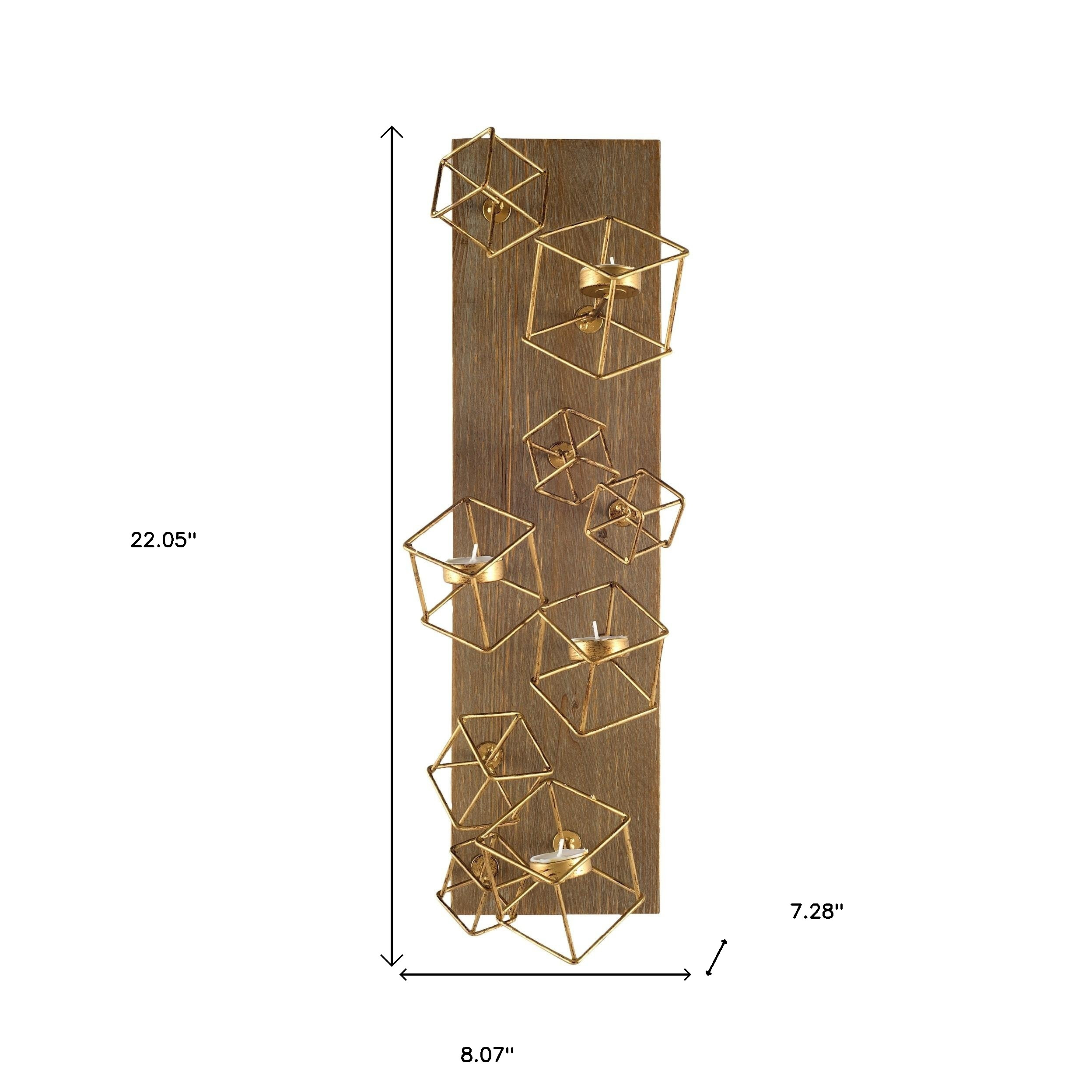 Re-imagine your living space with this elegant 22-inch brass distressed geometric brass and solid wood wall sconce candle holder. Handmade by skilled craftsmen and designed to add a glamorous glow to any event or table setting. Add an extra pop of personality to every corner of your home with this gorgeous candleholder candleholders are a decorative accent on their own. With our without candles. 22.05-inch h x 8.07-inch w x 7.28-inch d.