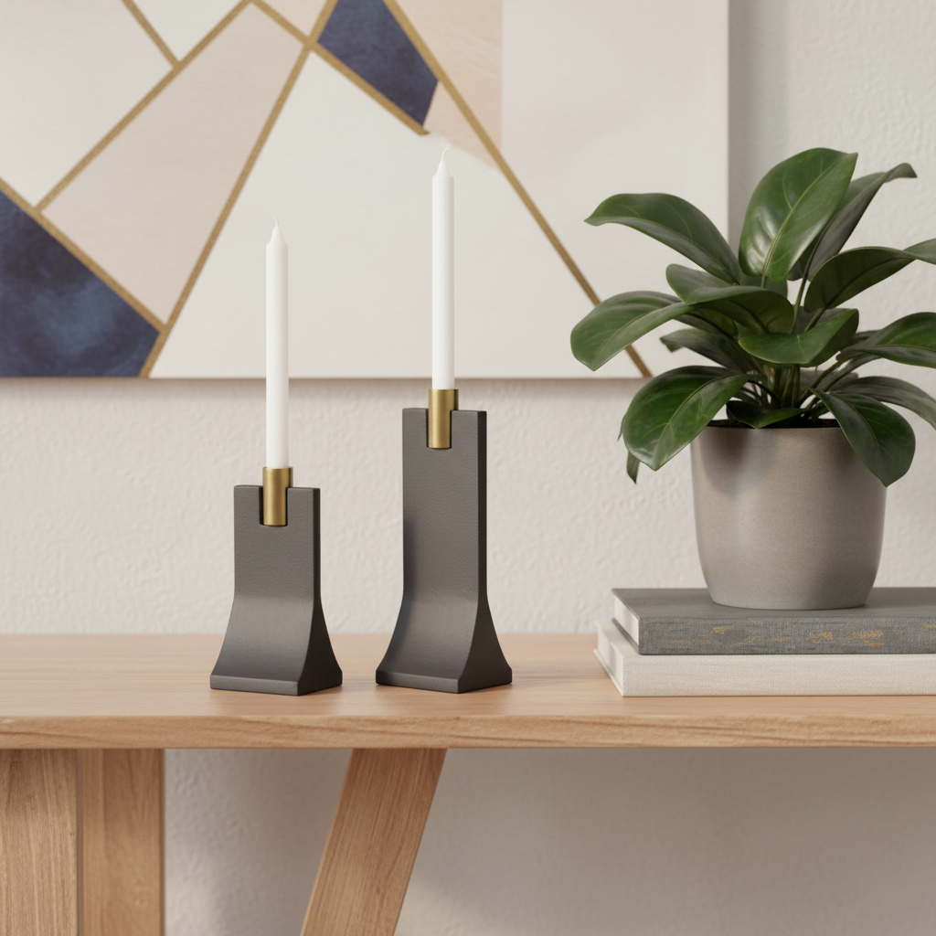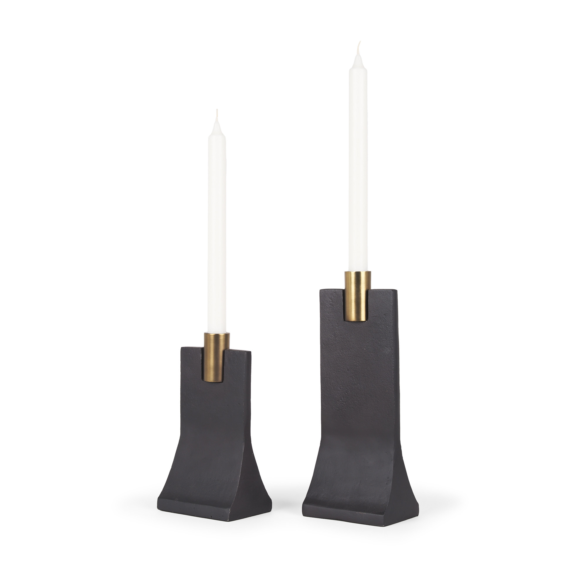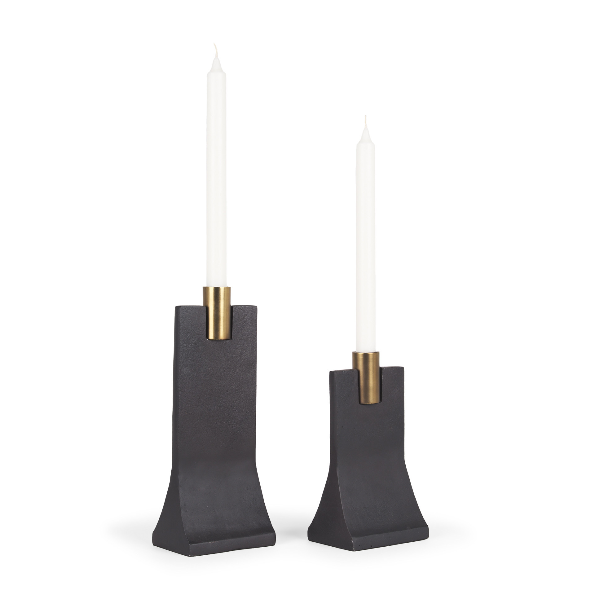 This set of two black and gold distressed hammered metal tabletop taper candle holders is a great addition to your home decor and sure to complement your existing furniture. Handmade by skilled craftsmen and designed to add a glamorous glow to any event or table setting. This candleholder is the perfect illuminating design to accent your space in style. Candleholders are a decorative accent on their own. With our without candles. 11.4-inch h x 4.15-inch w x 4.33-inch d.