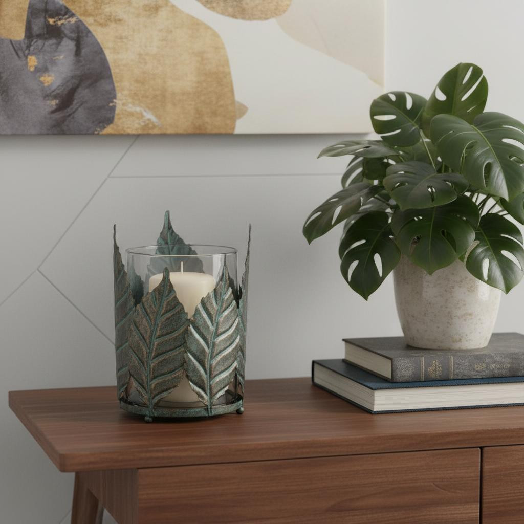 glass tabletop hurricane candle holder, tabletop hurricane candle holder, metal glass tabletop hurricane candle, hurricane candle holder, distressed botanical leaf metal |