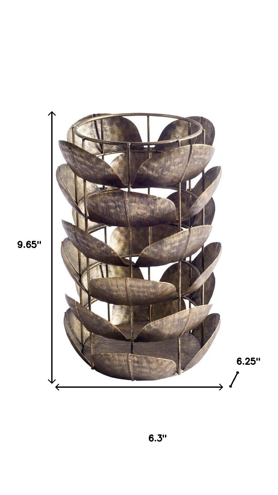 Bring the romantic glow of candlelight to your tabletop with this 10-inch bronze distressed botanical leaf metal tabletop hurricane candle holder handmade by skilled craftsmen and designed to add a glamorous glow to any event or table setting. This candleholder is the perfect illuminating design to accent your space in style. Candleholders are an attractive way to turn a simple candle into a piece of décor. 9.65-inch h x 6.3-inch w x 6.25-inch d.