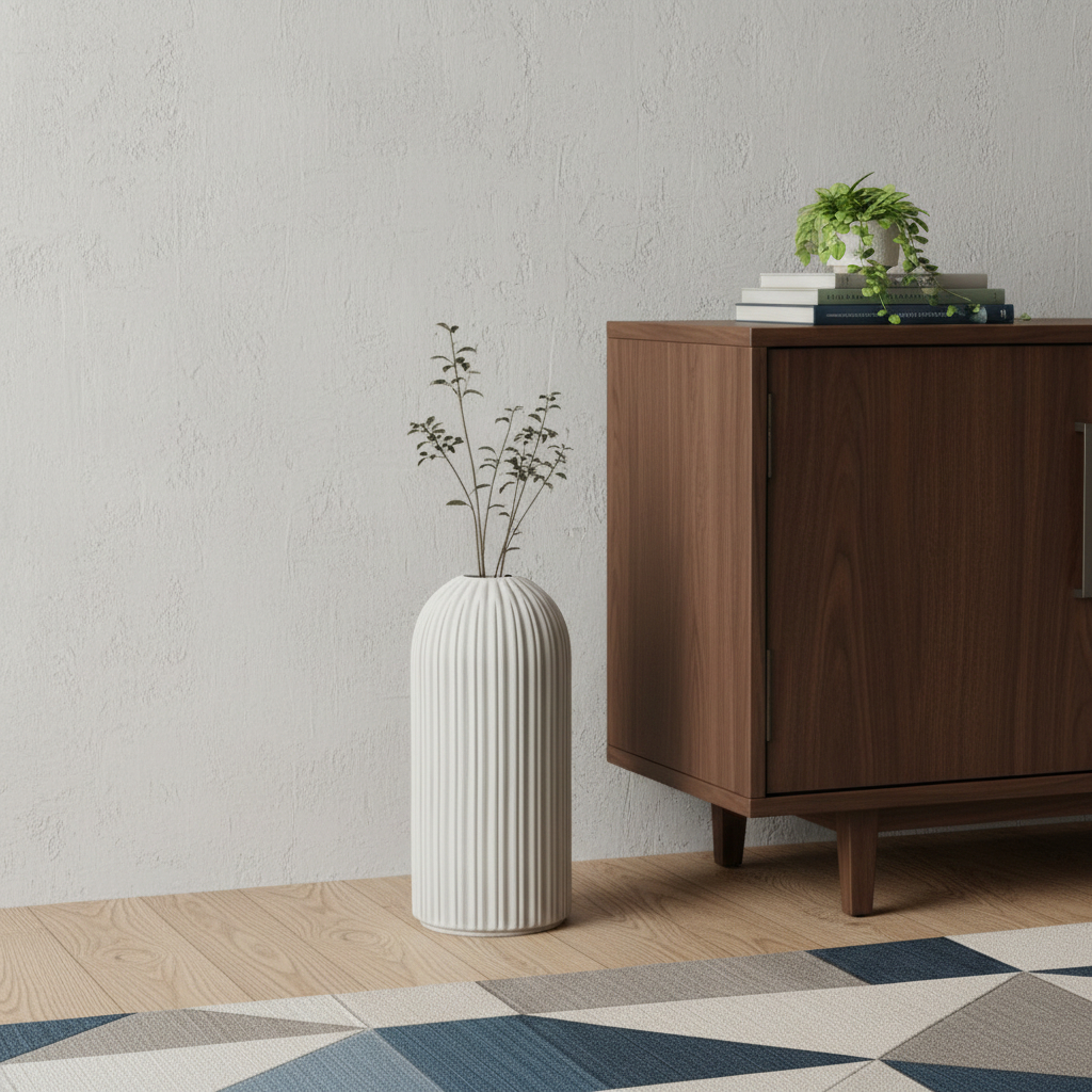 striped ceramic cylinder floor vase, ceramic cylinder floor vase, cylinder floor vase, white striped ceramic cylinder floor, gray white striped ceramic cylinder |