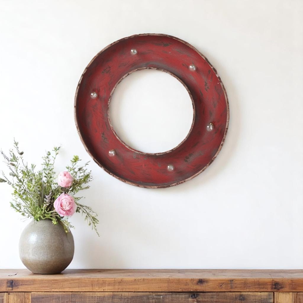 Handmade with care, this piece brings some authenticity to your space. With materials and a finish that is purposefully distressed, this hanging wall decor will instantly liven things up and bring color and dimension to your walls. Featuring a modern design, its circular shape adds visual interest while the metal construction ensures durability. This hanging dimensional sculpture is not only a stunning accent but also an enchanting lighted feature that creates a warm ambiance. Perfect for enhancing any contemporary room aesthetic, it serves as a striking conversation starter. 17.00-inch h x 17.00-inch w x 2.00-inch d.
