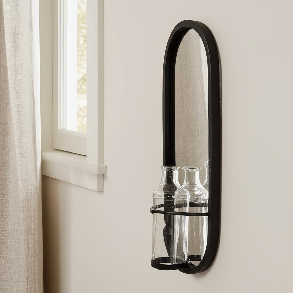 metal mirrored glass wall vase, mirrored glass wall vase, glass wall vase, clear oval metal mirrored glass, 19" black clear oval metal |