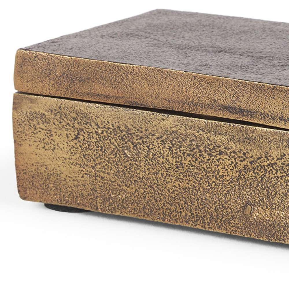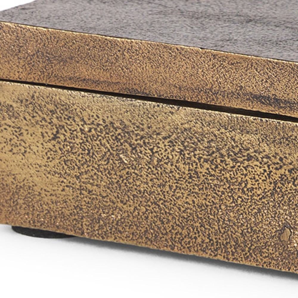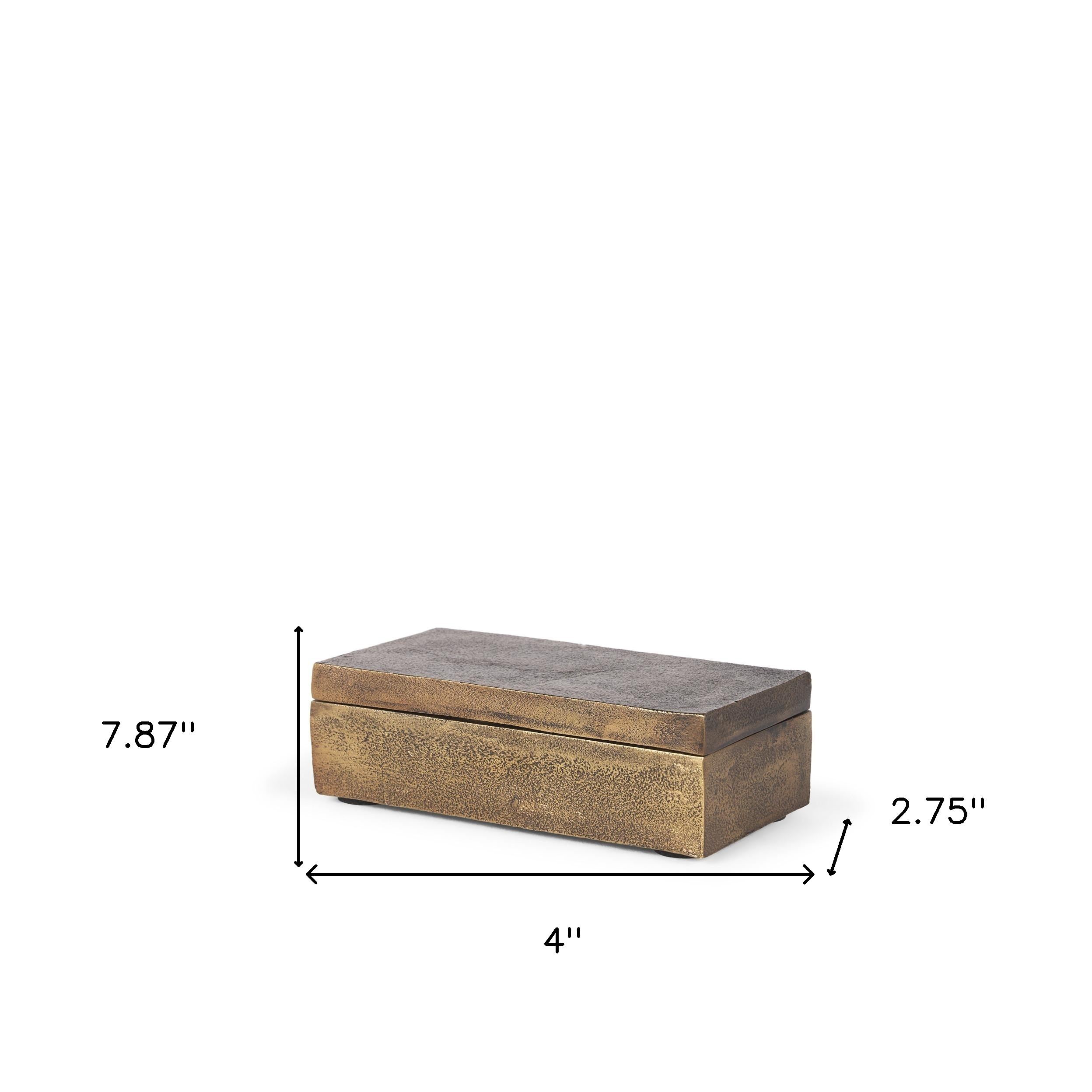 Unique and decorative, this 3-inch gold metal decorative box tabletop sculpture will leave a lasting impression. This unique decorative object makes a great piece for your coffee table, desk, or bookshelf. This charming decorative accent is expertly made of high grade metal in a gold coloration. It's a perfect addition for those who love an up-to-the-minute look and feel. 2.75-inch h x 7.87-inch w x 4-inch d.