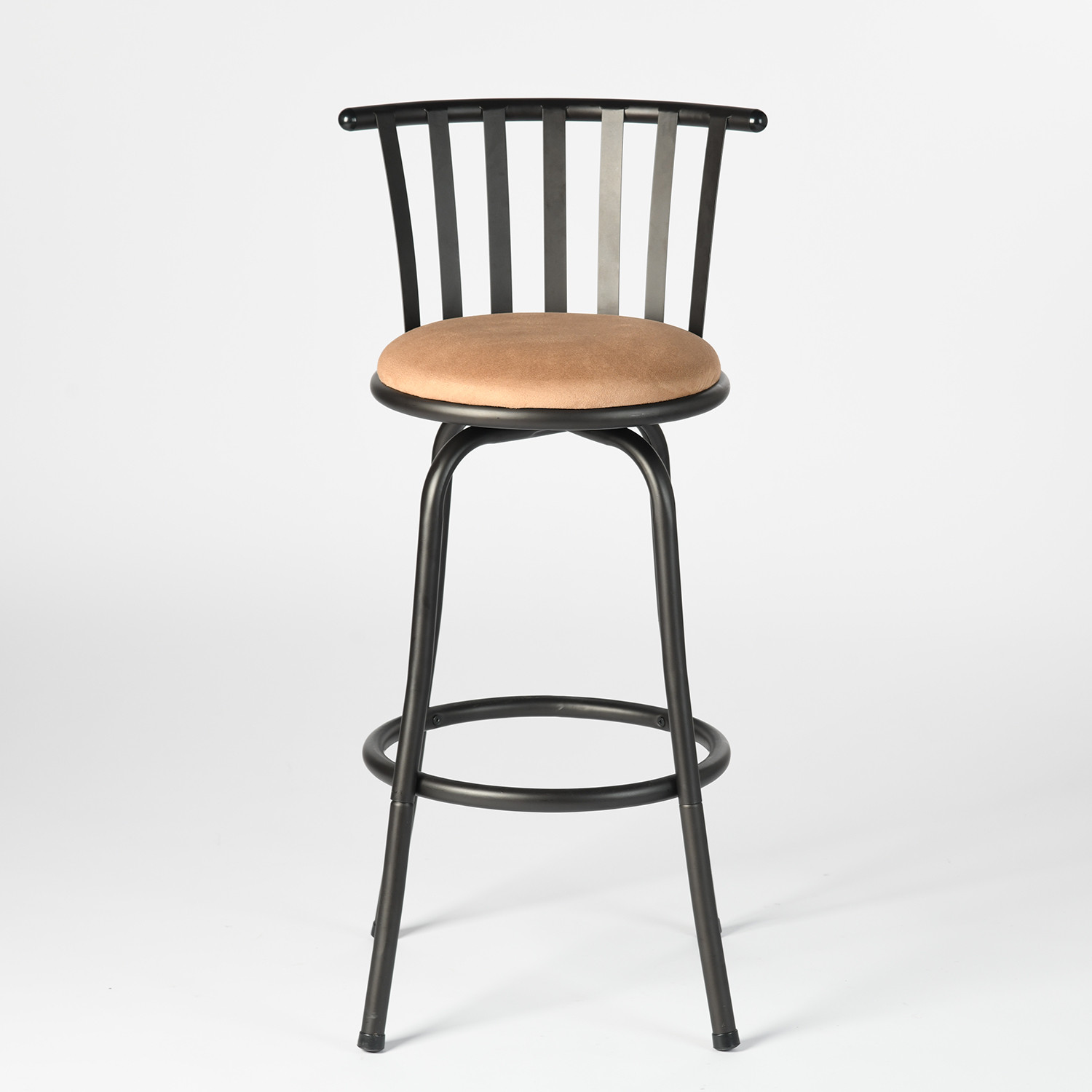 Bring a trendy bar vibe to your space, with this set of two khaki and black suede faux leather and iron low back adjustable height swivel bar chairs. Quality construction from black iron combines with khaki suede to give this stool a fresh and updated look. The round shape of the seat combines with a low back to give this chair a comfortable and fashionable look. 32.68-inch h x 14.76-inch w x 14.76-inch d.