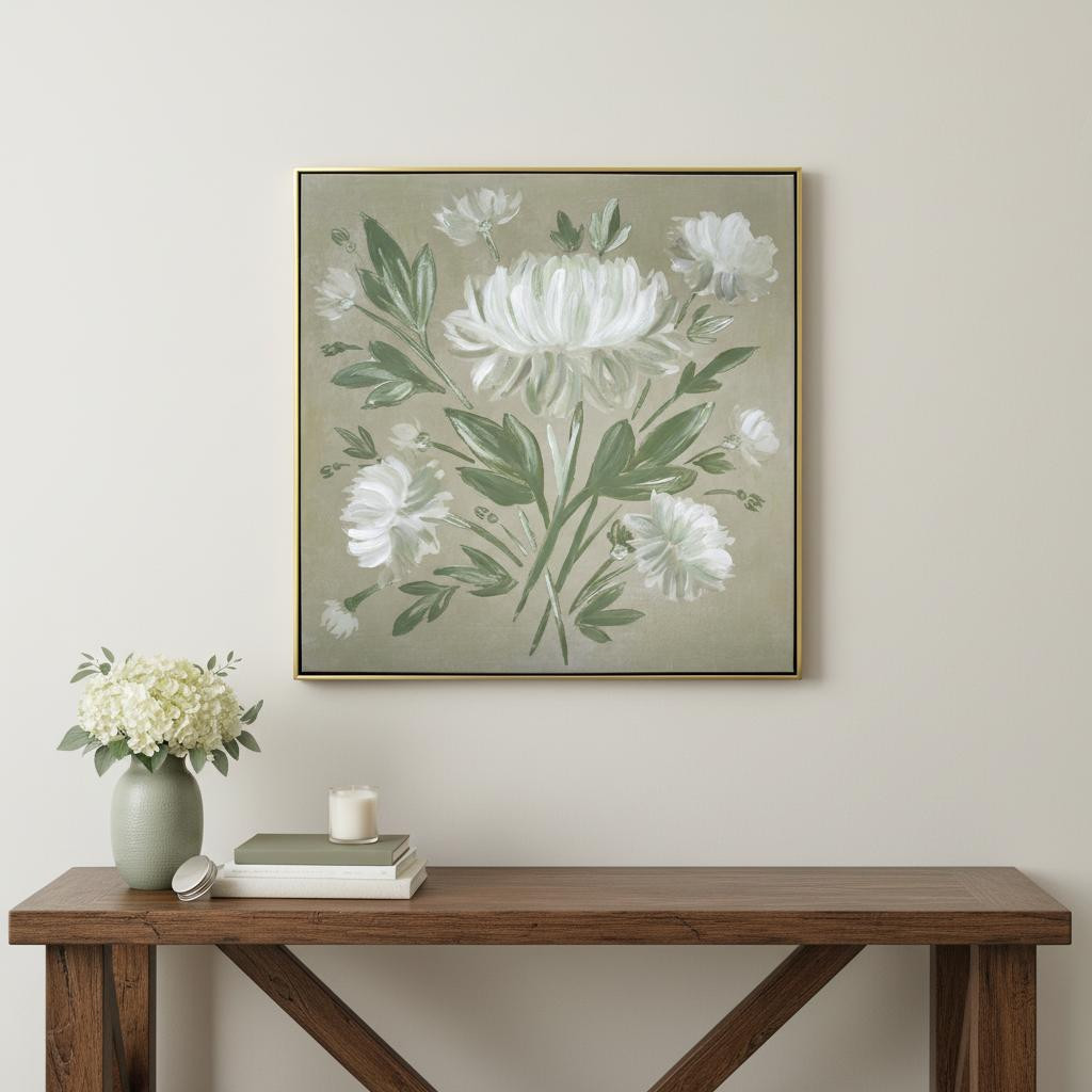 Add an air of fashion to your room and rejuvenate the space with this white flower bouquet gold floater frame wall art. This acrylic painting is a way to express your artistic style and add some fashion to your walls. Not a print, this fabulous work of art is truly hand-painted. Reproduced for you on canvas, this hanging decorative accent will be a trendy and fashionable way to dress your walls. Adding this hanging wall art to your space to make your room feel more finished and attractive. Instantly liven up your space with this art that brings color and dimension to your walls. 30-inch h x 30-inch w x 1.5-inch d.