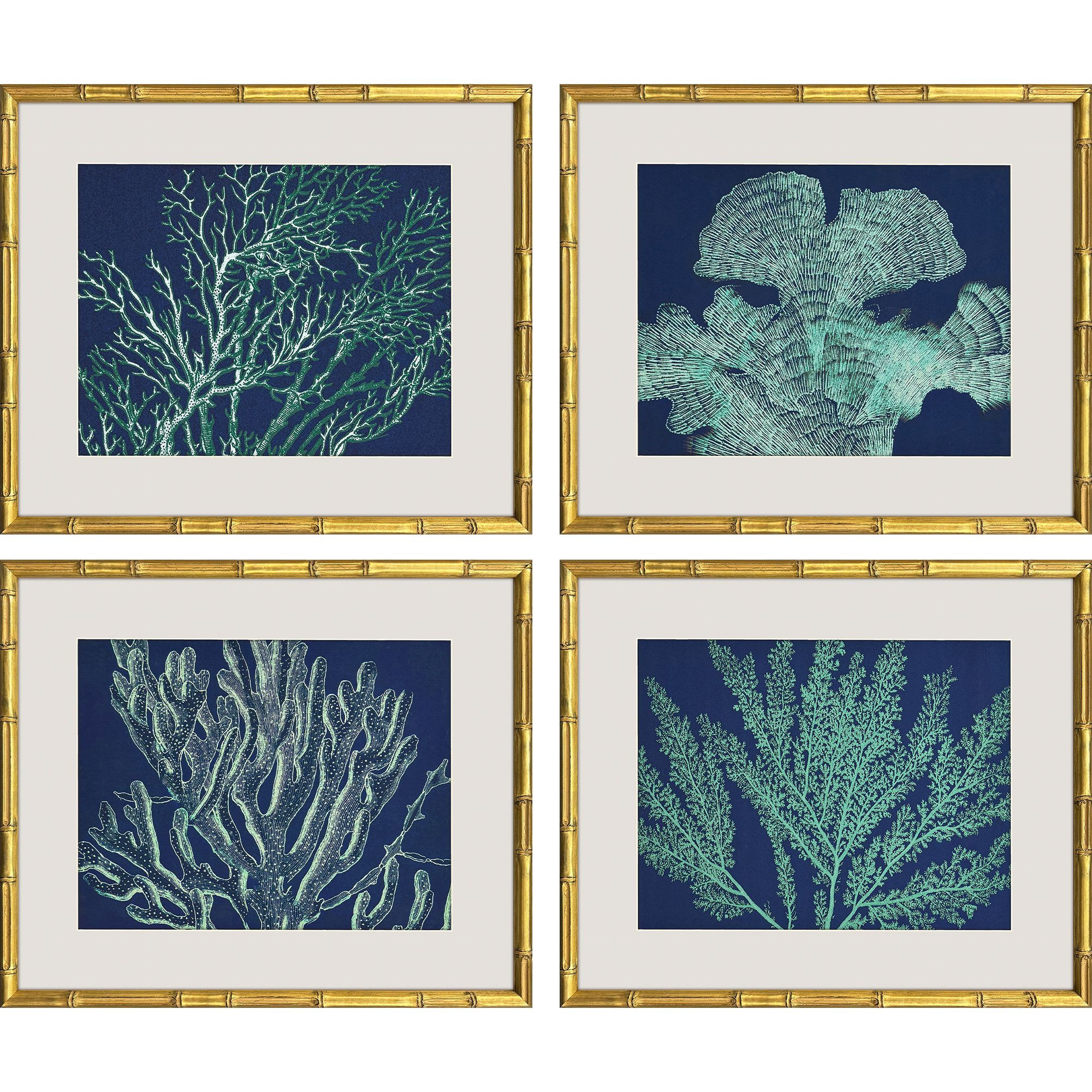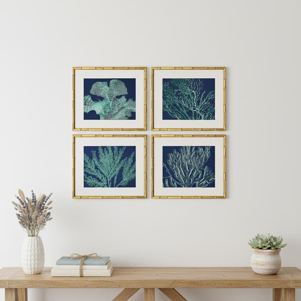 Unique and decorative, this set of four sea garden gold framed wall art will leave a lasting impression. This block print is a way to express your artistic style and add some fashion to your walls. Reproduced for you on paper, this hanging decorative accent will be a trendy and fashionable way to dress your walls. Hang on your wall to add some up to date fashion and decoration. Instantly liven up your space with this art that brings color and dimension to your walls. 16.00-inch h x 19.00-inch w x 2.00-inch d.