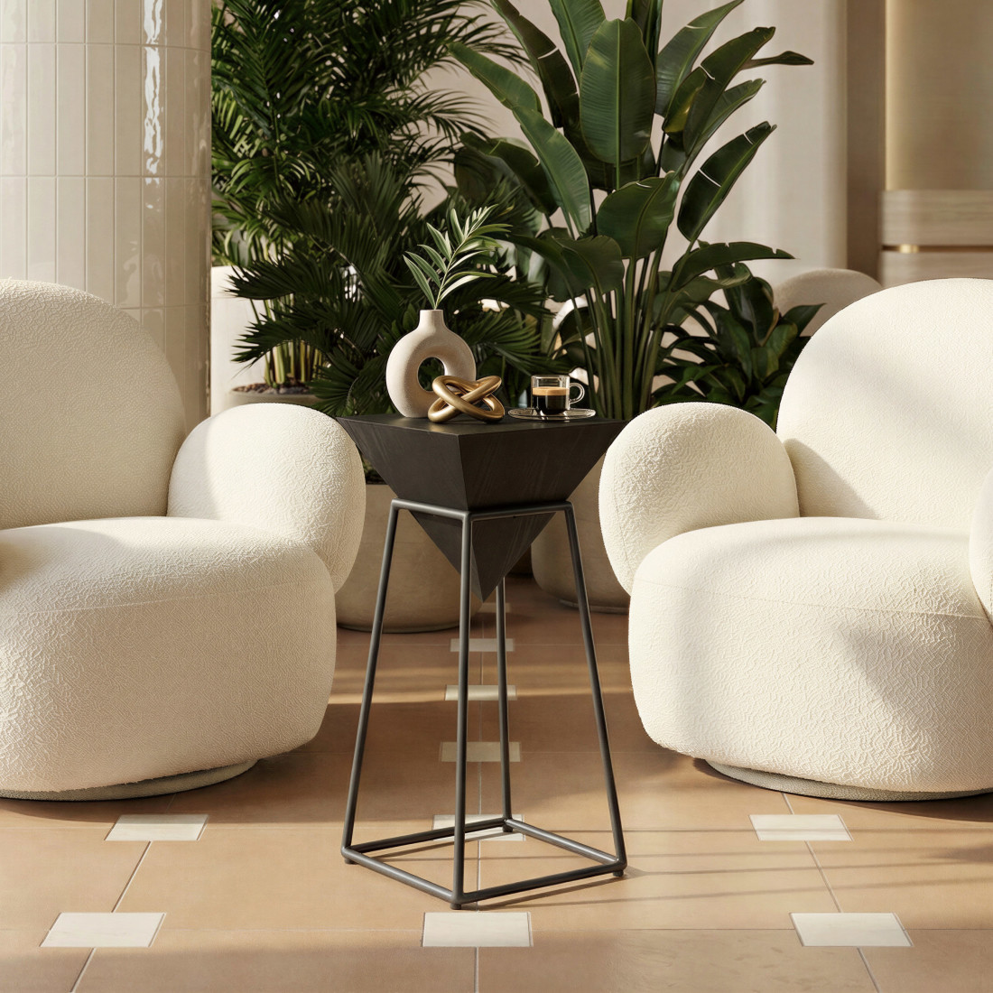 Distinctive in style the 25-inch black steel pedestal end table radiates a versatile charm. Made of steel, the black coloration throughout gives this piece an updated and refreshing look. An ideal location for placing your snacks and drinks, and a place to keep your lamp, frames, or other accessories. You can match it with other pieces to get the ideal look for your place. 24.60-inch h x 12.00-inch w x 12.00-inch d.