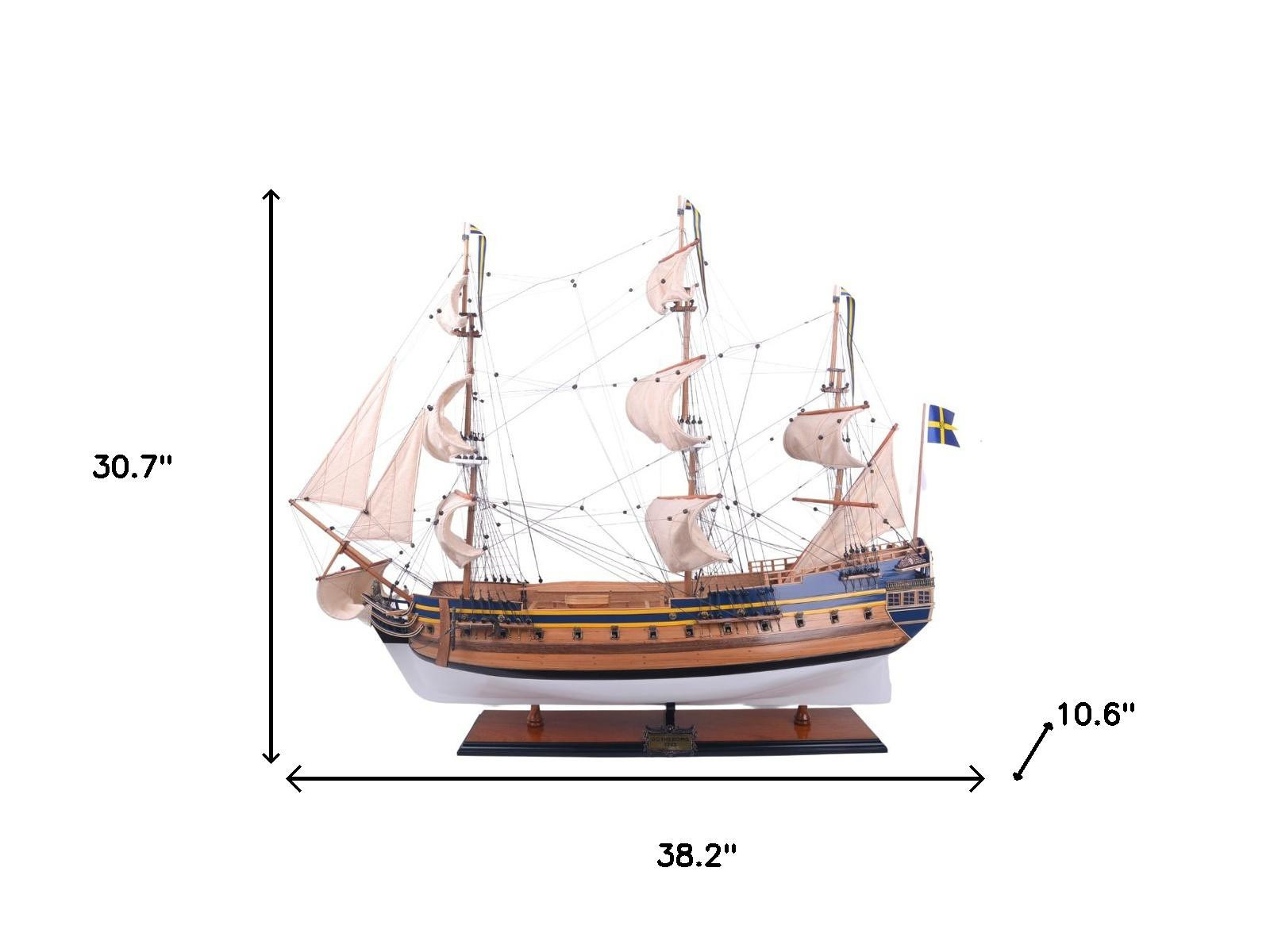 The 31-inch unfinished wood hand painted model boat is a stunning piece that showcases a blend of artistry and craftsmanship. Handmade with care, this model boat features intricate hand-painted details that captivate the eye. Crafted from high-quality wood, it offers durability while enhancing the aesthetic appeal of any space. As a replica model of the gotheborg painted large admiral line, it pays homage to classic maritime design. The craftsman style adds a rustic charm, making it a perfect addition to your home decor. This sculpture not only serves as a decorative item but also as a conversation starter, perfect for enthusiasts and collectors alike. Add this unique piece to elevate your living area with its artistic flair. 30.70-inch h x 38.20-inch w x 10.60-inch d.