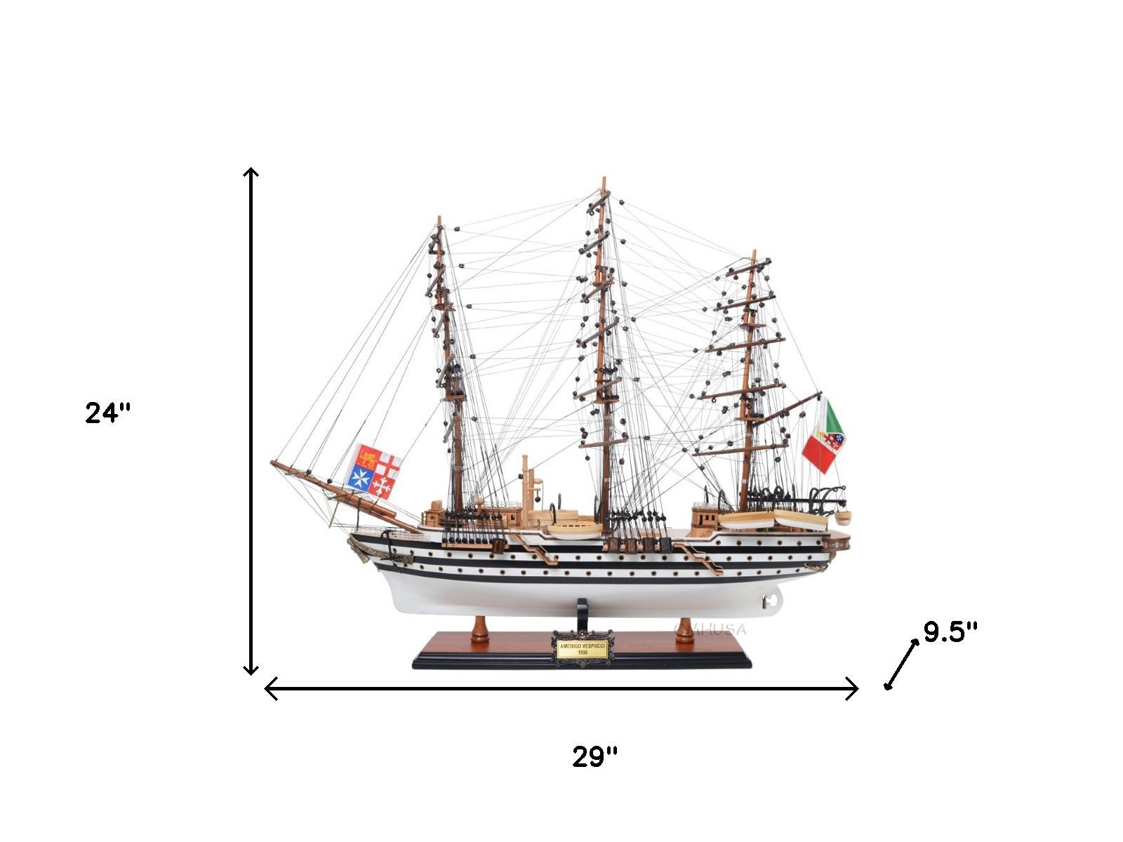 This 24-inch unfinished wood hand painted model boat will add a beautiful decorative accent to your decor. This replica makes a great tabletop accent for your coffee table, desk, bookshelf, dresser or mantle. A perfect decorative addition for anyone who loves nostalgia and vintage style models and replicas. A perfect decorative addition for anyone who loves a stylish look and feel. 24.00-inch h x 29.00-inch w x 9.50-inch d.