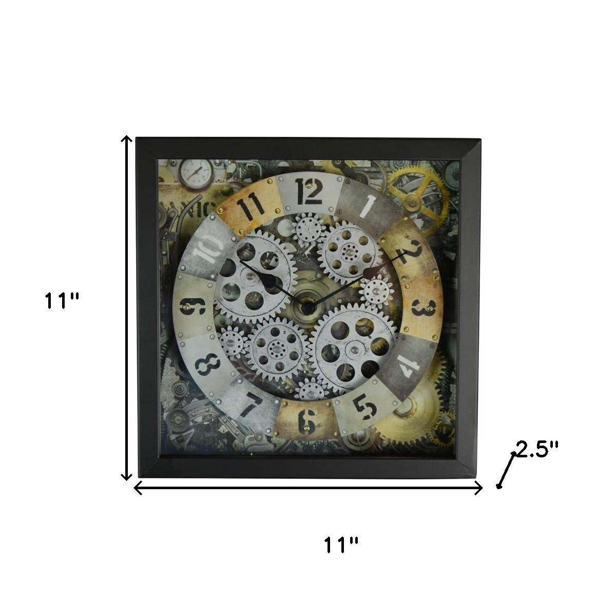 With its face removed, this 11-inch black gold and silver metal silent skeleton distressed exposed gear square wall clock showcases an industrial style that features the gears, springs, and cogs. Features a practical, straight-edged square shape. The clock face not only looks good but is beautiful and uniquely made from metal. This clock was skillfully made with a purposefully distressed and vintage style finish. Elevate the decor of any room in your house. The eye-catching makeup of this clock will ensure that you never run late again. 11-inch h x 11-inch w x 2.5-inch d.