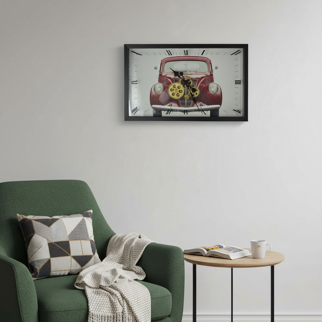 This 23-inch black white and red metal silent analog exposed gear wall clock includes three moving hands on the face that move smoothly to indicate the hour, minute and seconds. Features a practical, straight-edged rectangle shape. The clock face not only looks good but is beautiful and uniquely made from metal. Stay on track with this elegant and efficient clock. With its unique design and practical purpose, this clock will add flair to your home while also acting as an essential tool. 14.00-inch h x 22.50-inch w x 2.50-inch d.