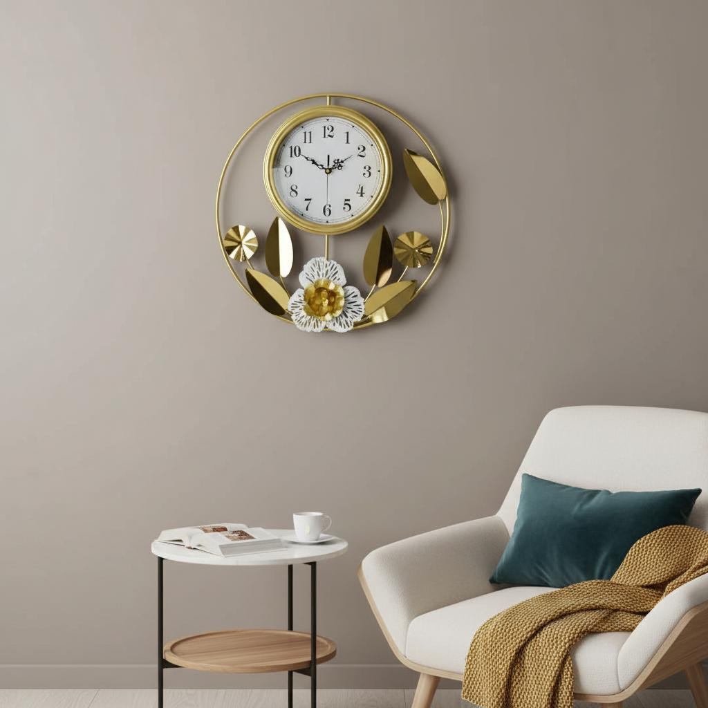 analog floral round wall clock, floral round wall clock, metal silent analog floral round, round wall clock, gold white metal silent analog |