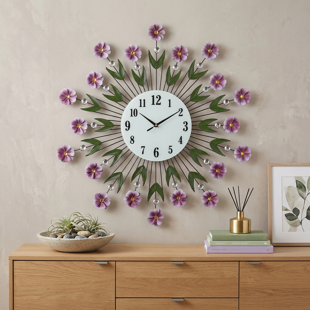 analog floral round wall clock, floral round wall clock, round wall clock, metal glass silent analog floral, purple green white metal glass |