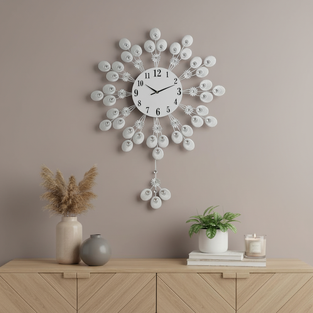 silent pendulum starburst wall clock, pendulum starburst wall clock, metal silent pendulum starburst wall, white metal silent pendulum starburst, metal silent pendulum starburst |