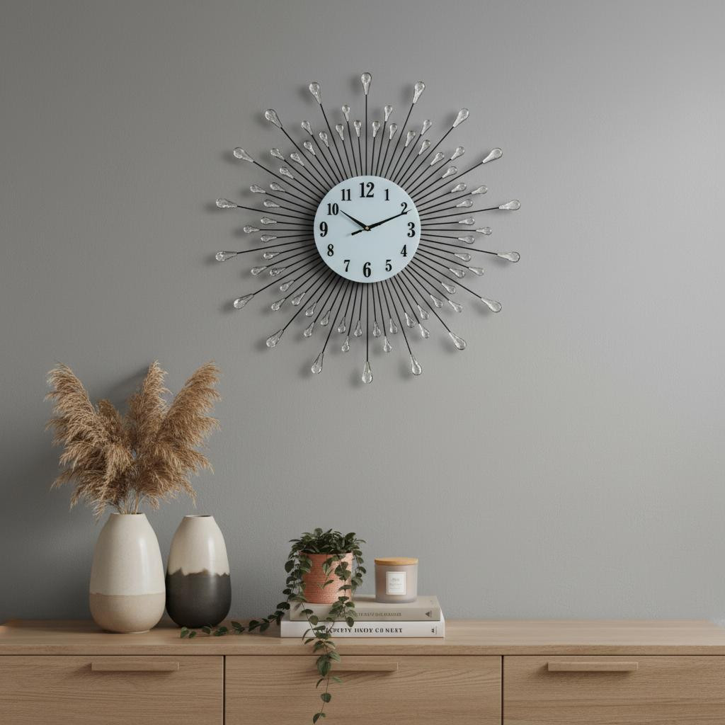 This 27-inch silver and white metal silent analog round wall clock includes three moving hands on the face that move smoothly to indicate the hour, minute and seconds. Has a traditional round shape, which brings an essence of wholeness to your home. The clock face not only looks good but is beautiful and uniquely made from glass. Stay on track with this elegant and efficient clock. The eye-catching makeup of this clock will ensure that you never run late again. 27.00-inch h x 27.00-inch w x 2.00-inch d.