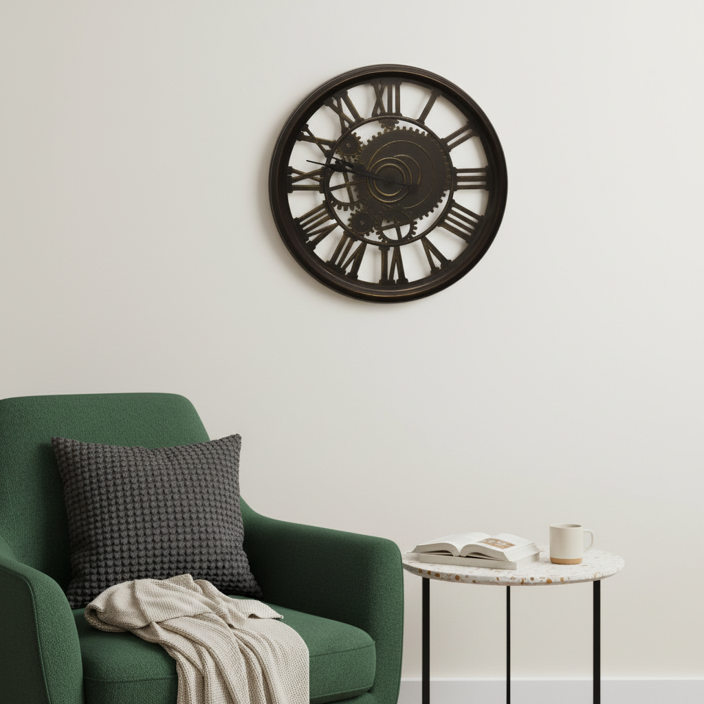 Industrial in style, this 20-inch antiqued gold and brown heavy duty plastic silent skeleton distressed exposed gear round wall clock features an eye-catching design to compliment the decor of your space. The round shape of this clock will bring a sense of wholeness to your home. The clock face not only looks good but is made from sturdy plastic that will stand the test of time. This clock was skillfully made with a purposefully distressed and vintage style finish. Elevate the decor of any room in your house. With its unique design and practical purpose, this clock will add flair to your home while also acting as an essential tool. 20.00-inch h x 20.00-inch w x 2.50-inch d.