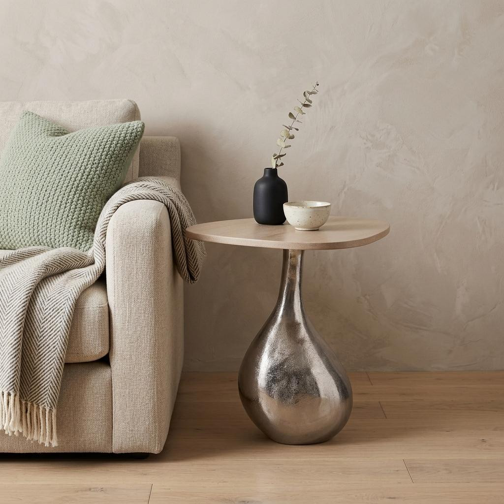Show off your exquisite taste with this 22-inch beige and silver marble and aluminum pedestal end table. The beige marble top of this table is a nice contrast to the high quality, silver cast aluminum of the base. A great accent on either side of the sofa or bed, this adorable end or side table is just what you need. This unique and modern table is a great accent for most any room. 21.75-inch h x 18.25-inch w x 17.25-inch d.