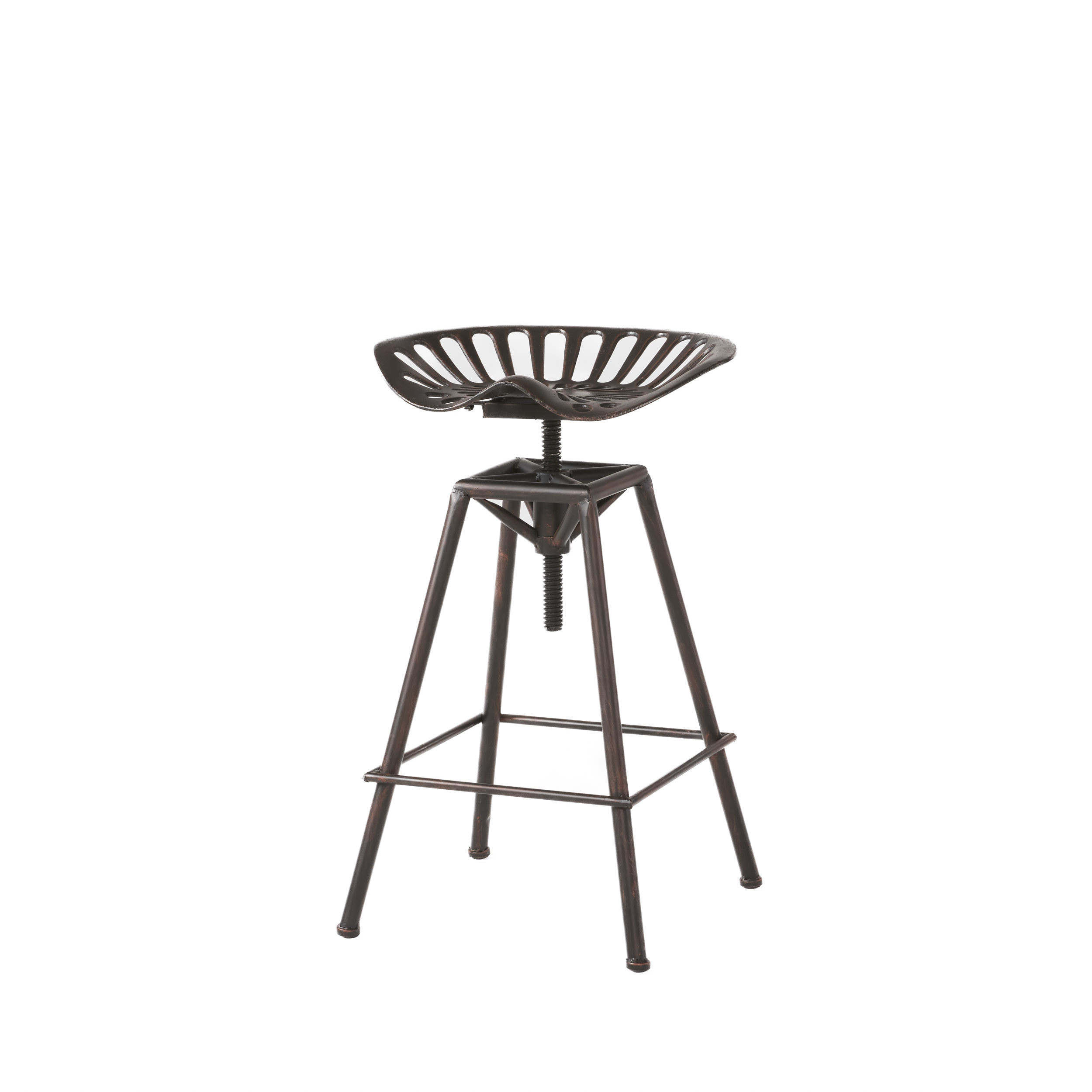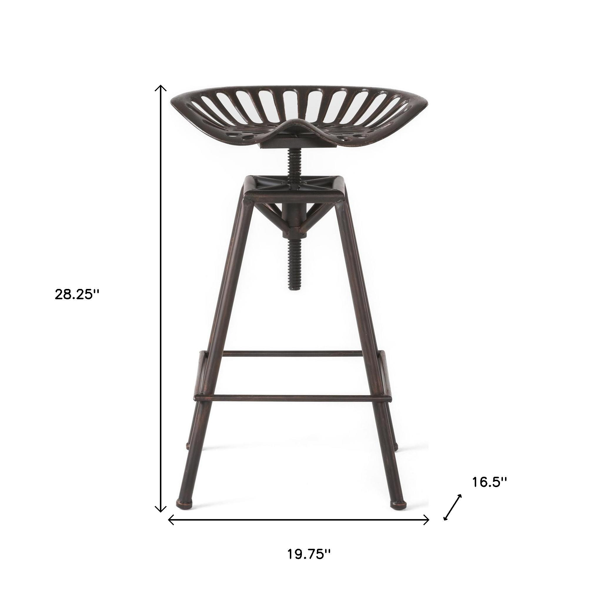 Bring a trendy cafe or bar vibe to your space, with this bronze iron backless adjustable height swivel bar chair. Rustic bronze colored iron gives this chair a chic monotone coloration. The swivel function, flexible sizing, backless design and tractor style seat makes this stool not only practical, but comfortable and fashionable as well. Designed with a footrest for comfort and convenience, this modern industrial bar stool will add a unique style to your space. 28.25-inch h x 19.75-inch w x 16.50-inch d.