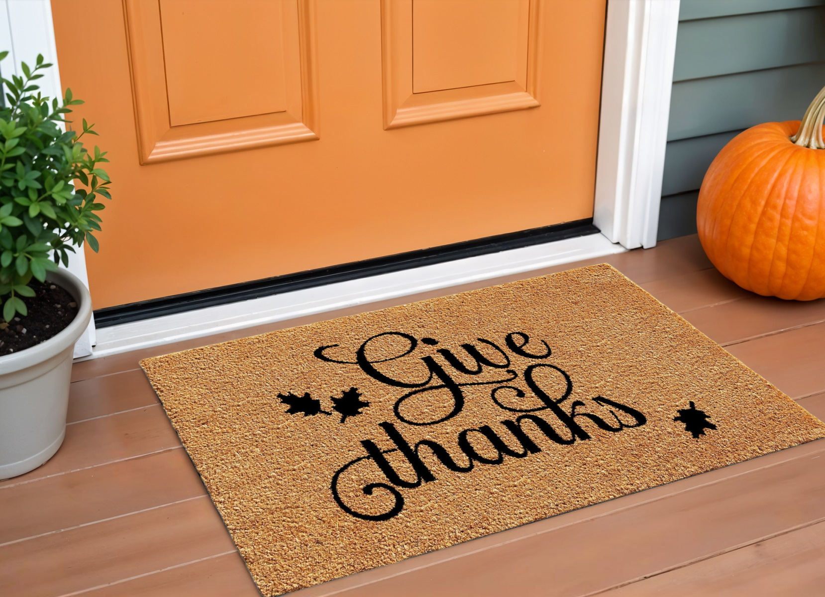 Known for it's extreme durability and ability to withstand heavy foot traffic, this 17-inch x 29-inch black and natural coir give thanks outdoor door mat is an ideal option for the front door or entrance way of your home or business. Crafted from coconut husks, this mat is not only functional but is an an eco-friendly and visually appealing accessory. The naturally bristled texture of coir is an efficient way to clean dirt and mud from shoes and is easy to clean and maintain. Add this festive and decorative "Give Thanks" mat to create a practical yet inviting welcome to all who enter. 17-inch h x 29-inch w x 0.6-inch d.