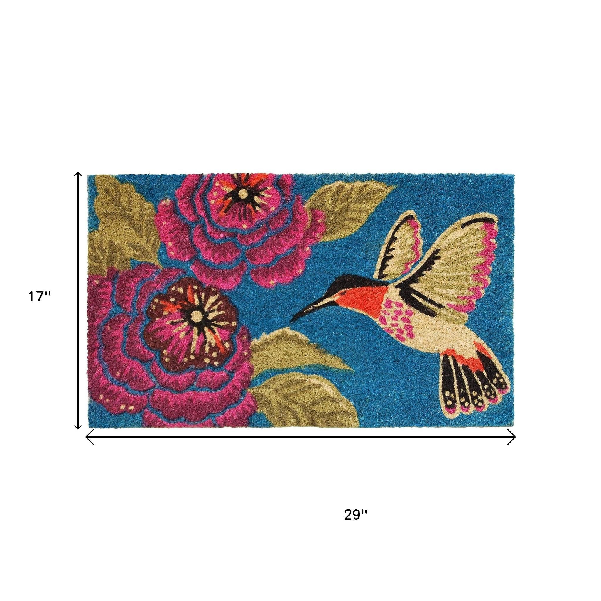 Known for it's extreme durability and ability to withstand heavy foot traffic, this 17-inch x 29-inch blue pink and green hummingbird outdoor coir door mat is an ideal option for the front door or entrance way of your home or business. Crafted from coconut husks, this mat is not only functional but is an an eco-friendly and visually appealing accessory. The naturally bristled texture of coir is an efficient way to clean dirt and mud from shoes and is easy to clean and maintain. Add this decorative mat to create a practical yet inviting welcome to all who enter. 17-inch h x 29-inch w x 0.6-inch d.