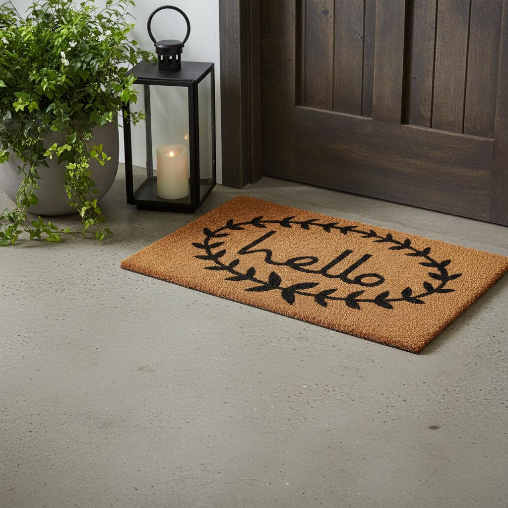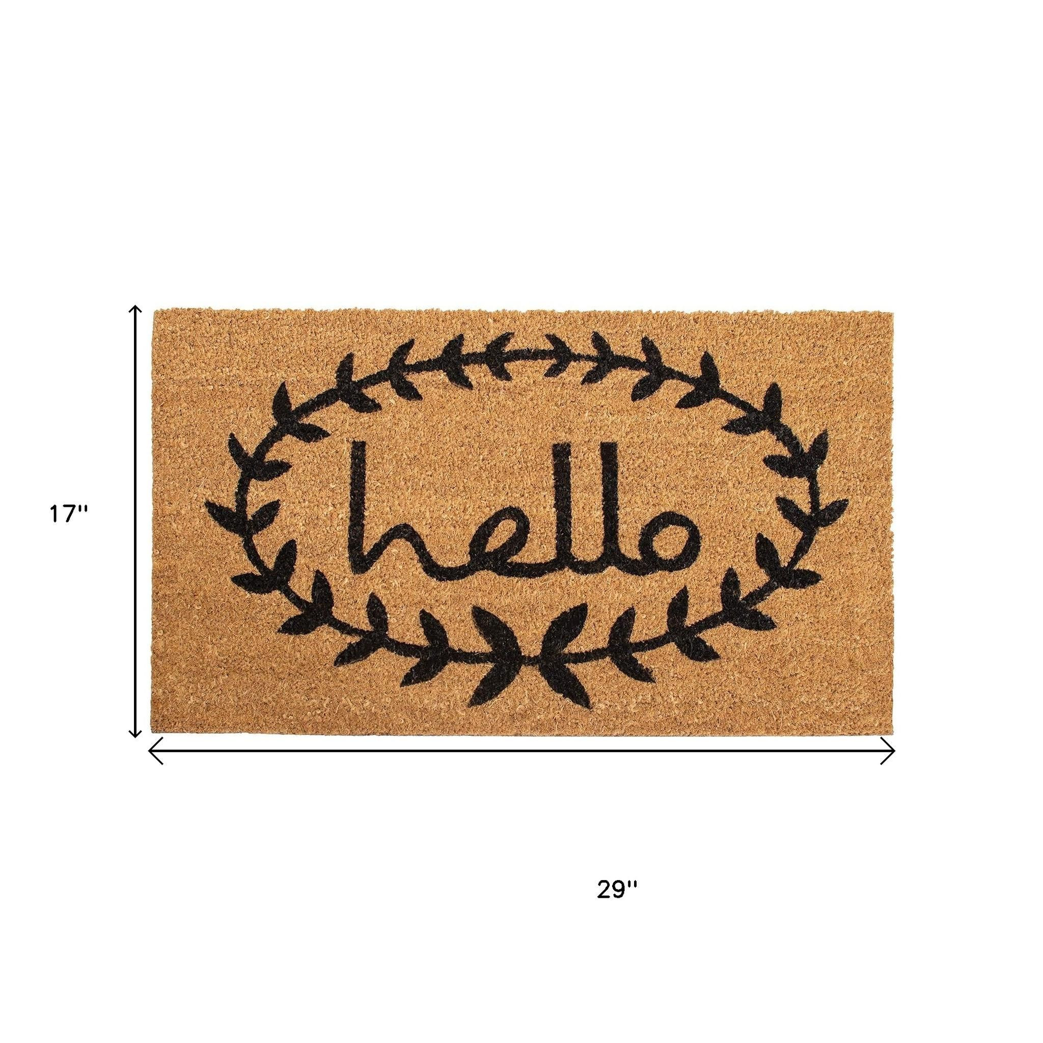 Known for it's extreme durability and ability to withstand heavy foot traffic, this 17-inch x 29-inch natural and black hello outdoor coir door mat is an ideal option for the front door or entrance way of your home or business. Crafted from coconut husks, this mat is not only functional but is an an eco-friendly and visually appealing accessory. The naturally bristled texture of coir is an efficient way to clean dirt and mud from shoes and is easy to clean and maintain. Add this decorative mat to create a practical yet inviting welcome to all who enter. 17-inch h x 29-inch w x 0.6-inch d.