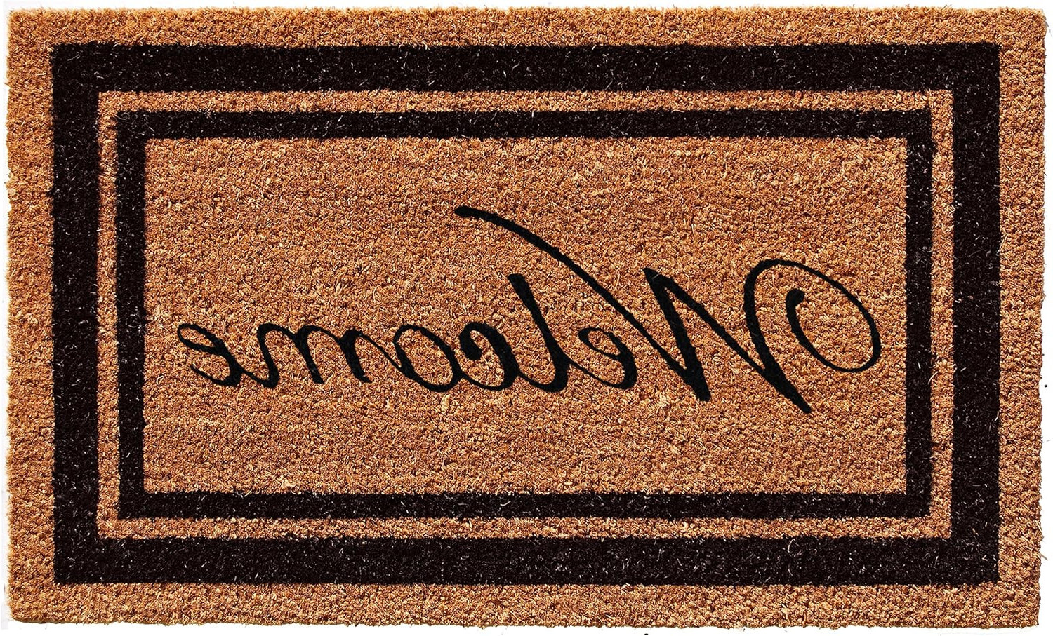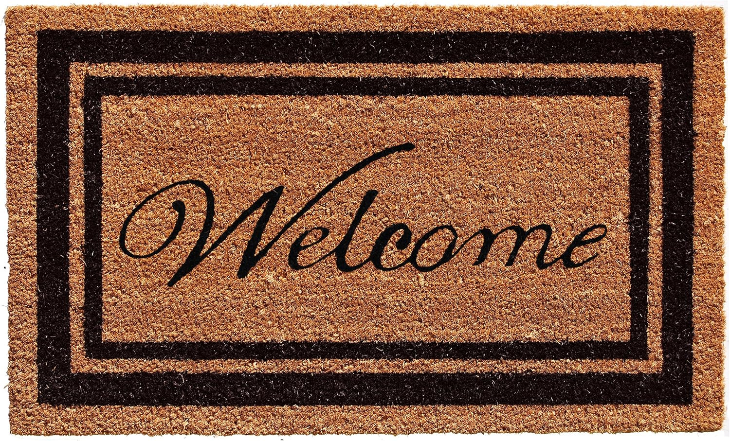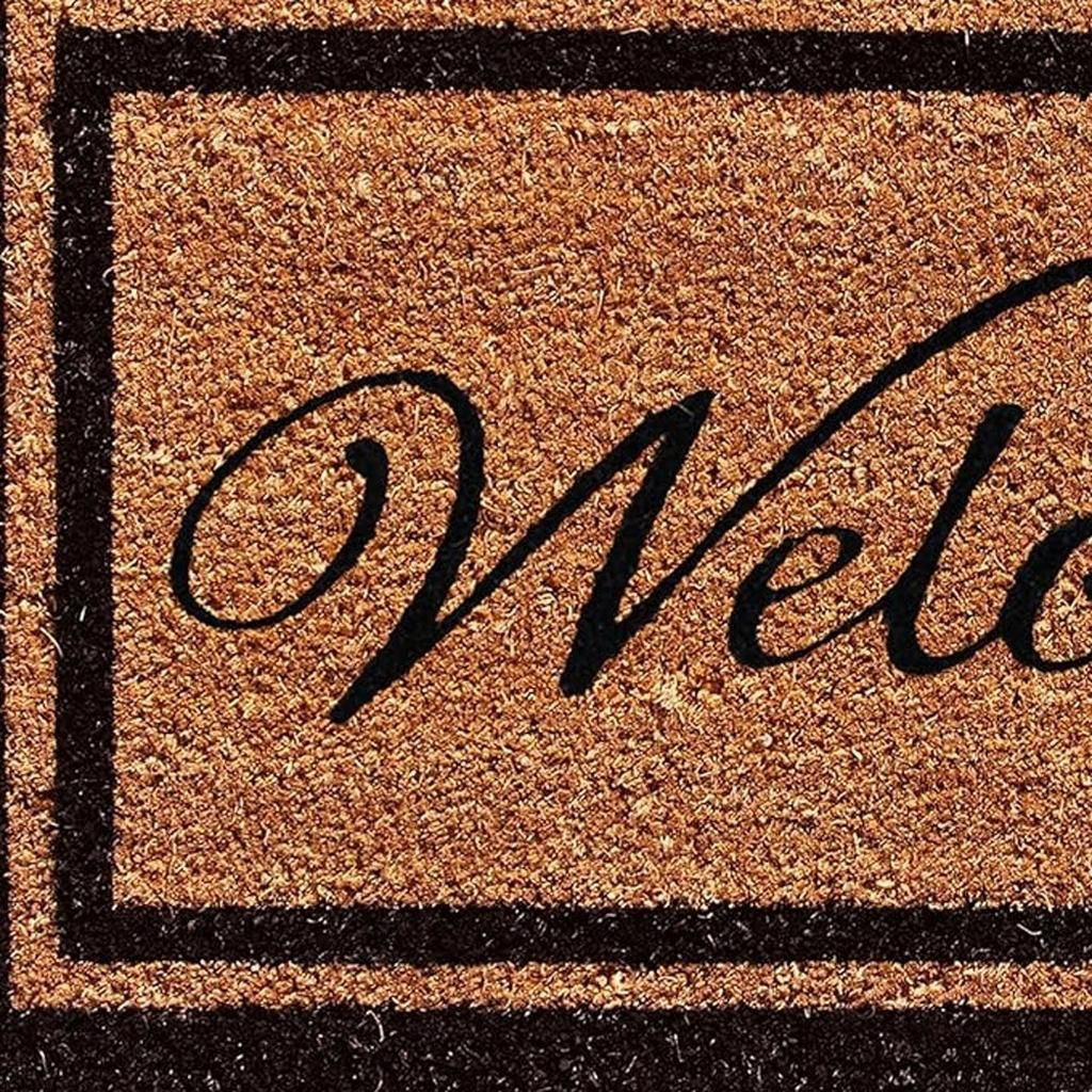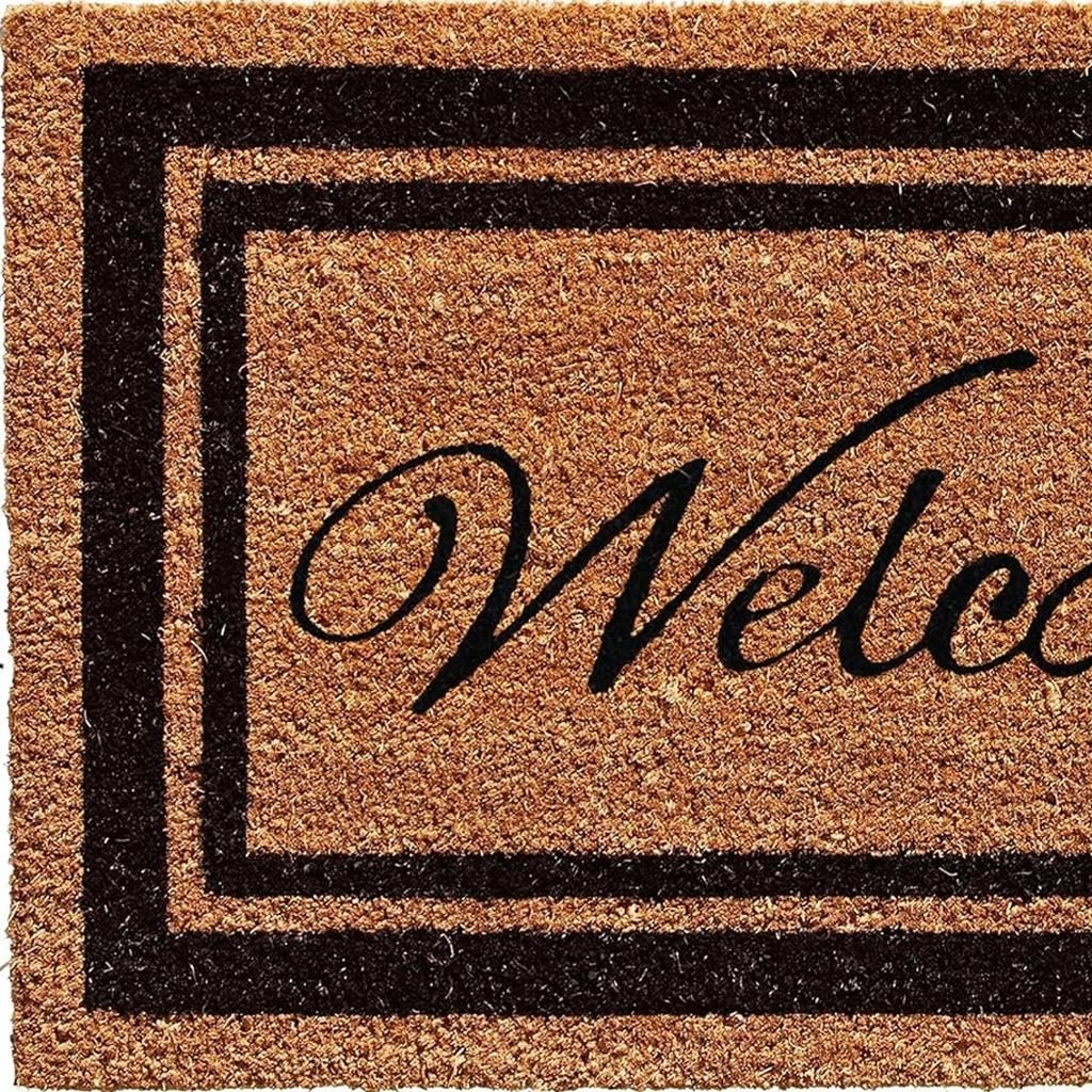 Known for it's extreme durability and ability to withstand heavy foot traffic, this 18-inch x 30-inch natural and black striped border welcome outdoor coir door mat is an ideal option for the front door or entrance way of your home or business. Crafted from coconut husks, this mat is not only functional but is an an eco-friendly and visually appealing accessory. The naturally bristled texture of coir is an efficient way to clean dirt and mud from shoes and is easy to clean and maintain. Add this decorative mat to create a practical yet inviting welcome to all who enter. 18-inch h x 30-inch w x 0.6-inch d.