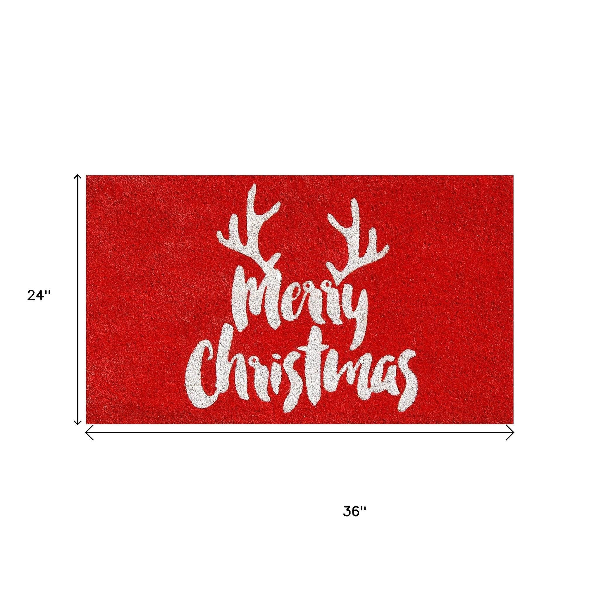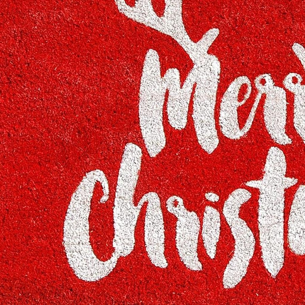 Known for it's extreme durability and ability to withstand heavy foot traffic, this 24-inch x 36-inch red and white coir reindeer outdoor Merry Christmas door mat is an ideal option for the front door or entrance way of your home or business. Crafted from coconut husks, this mat is not only functional but is an an eco-friendly and visually appealing accessory. The naturally bristled texture of coir is an efficient way to clean dirt and mud from shoes and is easy to clean and maintain. Add this festive and decorative Christmas mat to create a practical yet inviting welcome to all who enter. 24-inch h x 36-inch w x 0.6-inch d.