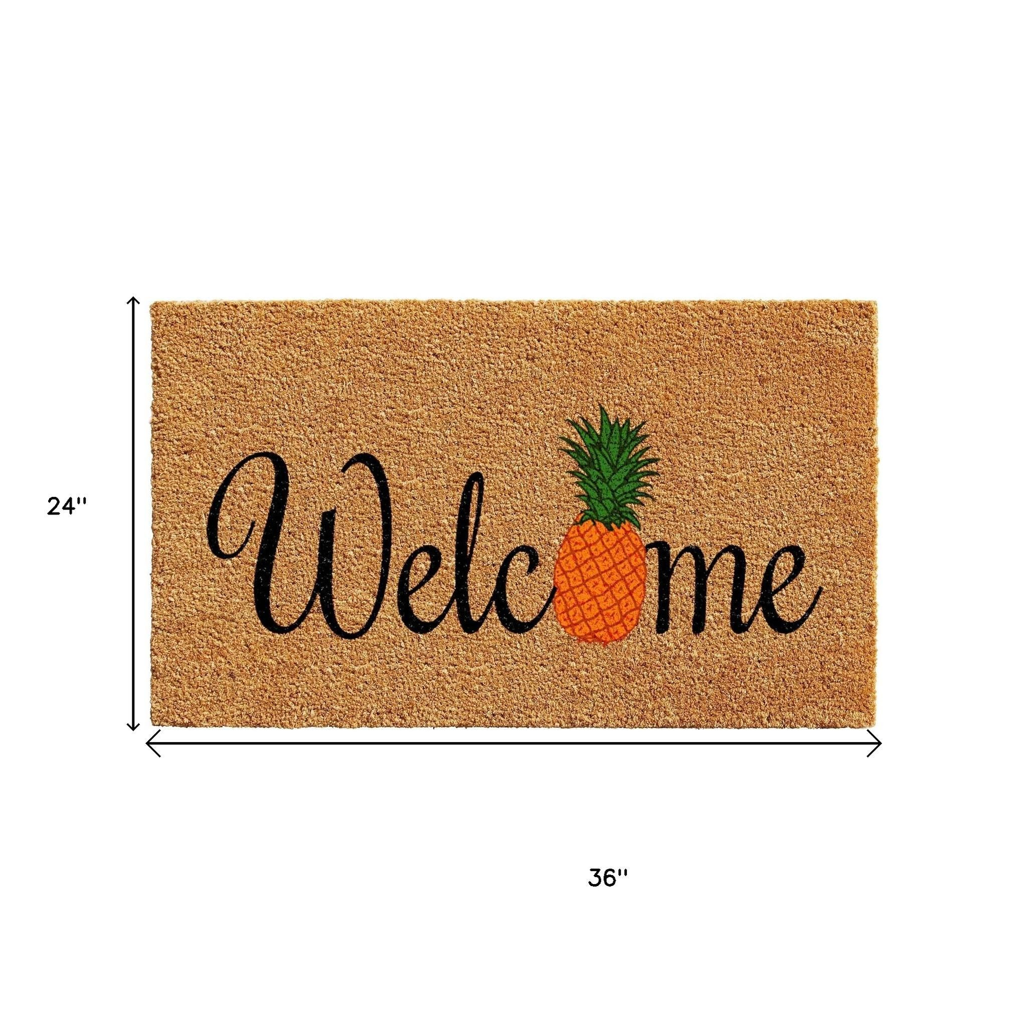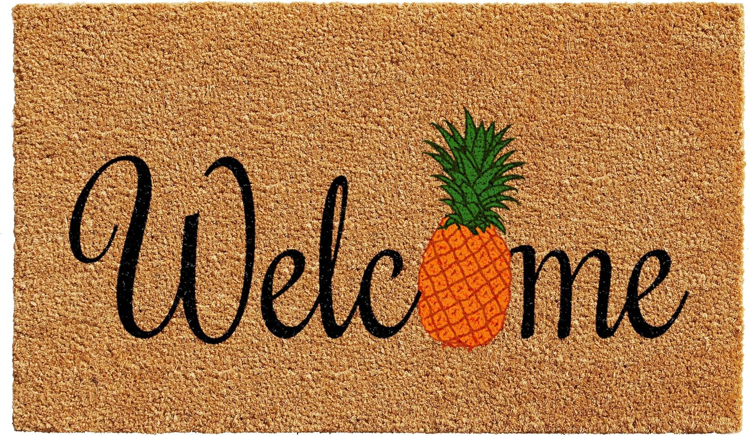 Known for it's extreme durability and ability to withstand heavy foot traffic, this 24-inch x 36-inch black and natural coir pineapple welcome outdoor door mat is an ideal option for the front door or entrance way of your home or business. Crafted from coconut husks, this mat is not only functional but is an an eco-friendly and visually appealing accessory. The naturally bristled texture of coir is an efficient way to clean dirt and mud from shoes and is easy to clean and maintain. Add this decorative mat to create a practical yet inviting welcome to all who enter. 24-inch h x 36-inch w x 0.6-inch d.