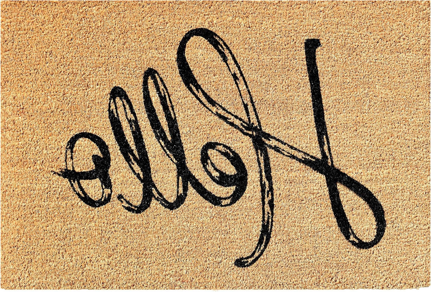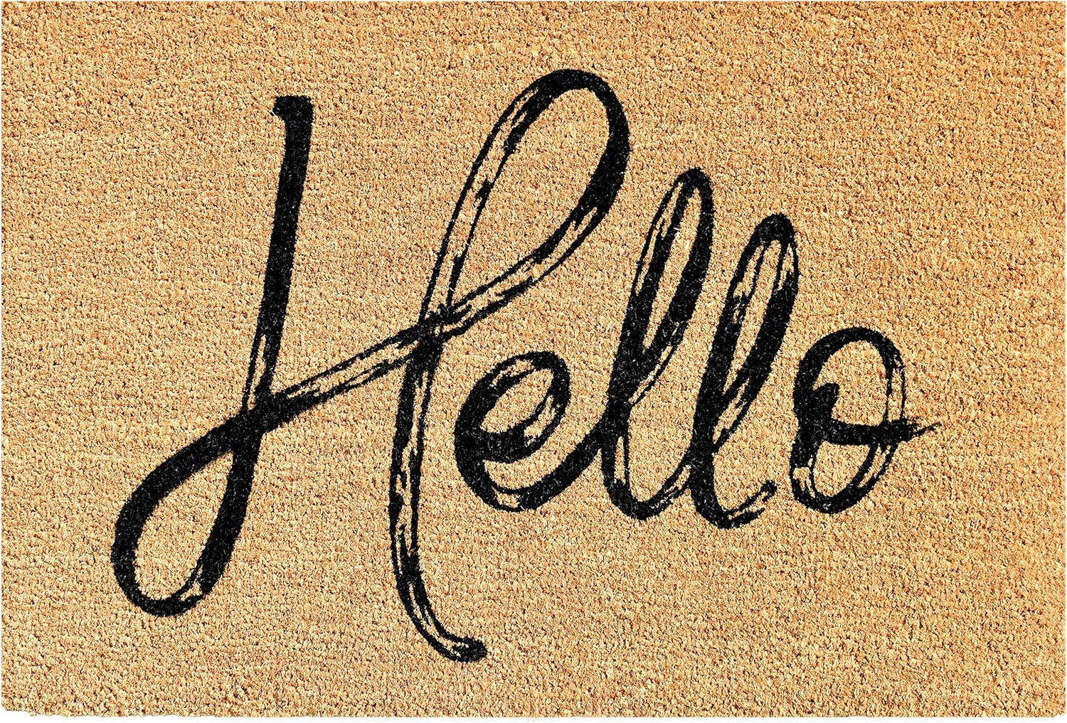 Known for it's extreme durability and ability to withstand heavy foot traffic, this 24-inch x 36-inch natural and black hello distressed outdoor coir door mat is an ideal option for the front door or entrance way of your home or business. Crafted from coconut husks, this mat is not only functional but is an an eco-friendly and visually appealing accessory. The naturally bristled texture of coir is an efficient way to clean dirt and mud from shoes and is easy to clean and maintain. Add this decorative mat to create a practical yet inviting welcome to all who enter. 24-inch h x 36-inch w x 0.6-inch d.