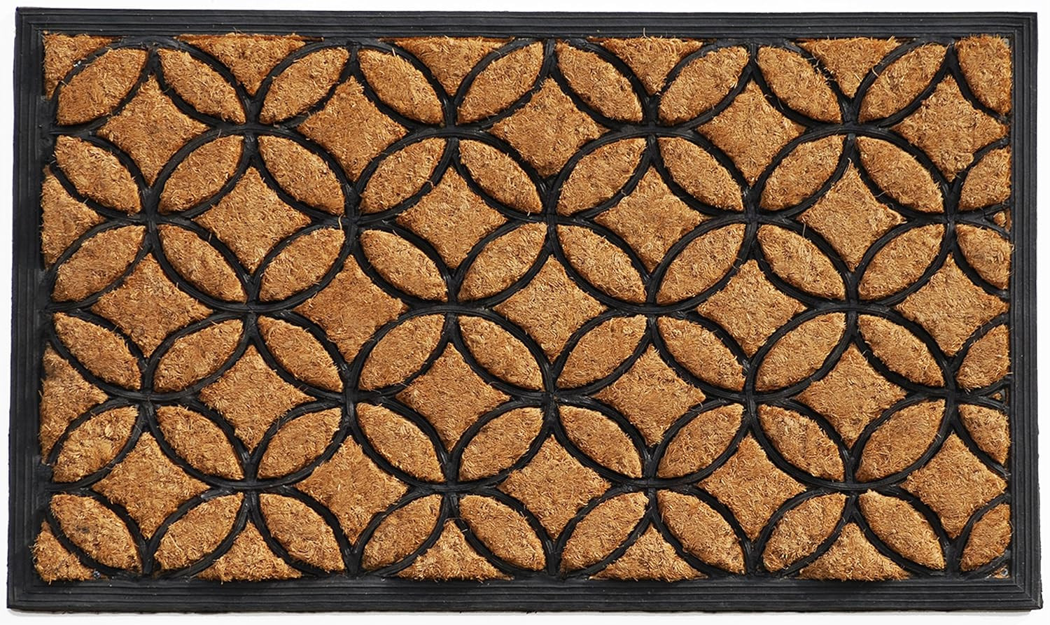 Known for it's extreme durability and ability to withstand heavy foot traffic, this 24-inch x 36-inch black and natural geometric outdoor coir and rubber door mat is an ideal option for the front door or entrance way of your home or business. This mat is not only functional but is a visually appealing accessory to welcome people to your home or business. Add this geometric circles decorative mat to create a practical yet inviting welcome to all who enter. 24-inch h x 36-inch w x 1-inch d.