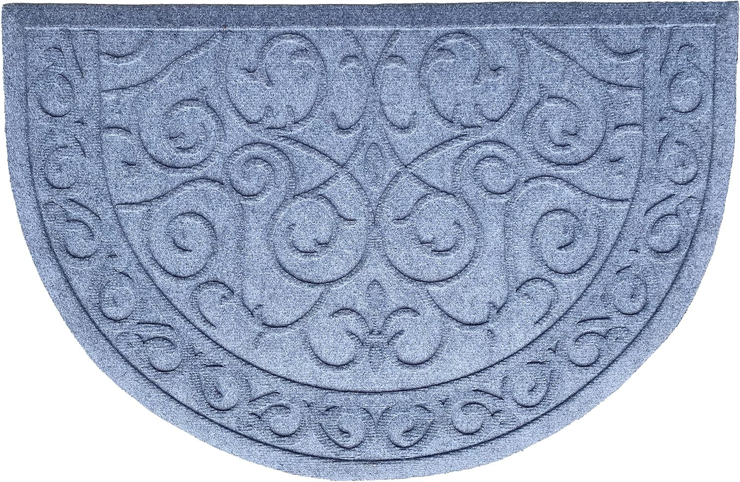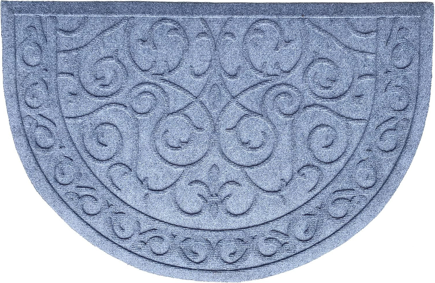 Ready to withstand heavy foot traffic, this 18-inch x 30-inch gray scrollwork semi circle outdoor polypropylene door mat is an ideal option for the front door or entrance way of your home or business. Crafted from polypropylene, with a pretty tone-on-tone scrollwork pattern, this mat is not only functional but is a visually appealing accessory to welcome people to your home or business. Add this decorative mat to create a practical yet inviting welcome to all who enter. 18-inch h x 30-inch w x 0.2-inch d.
