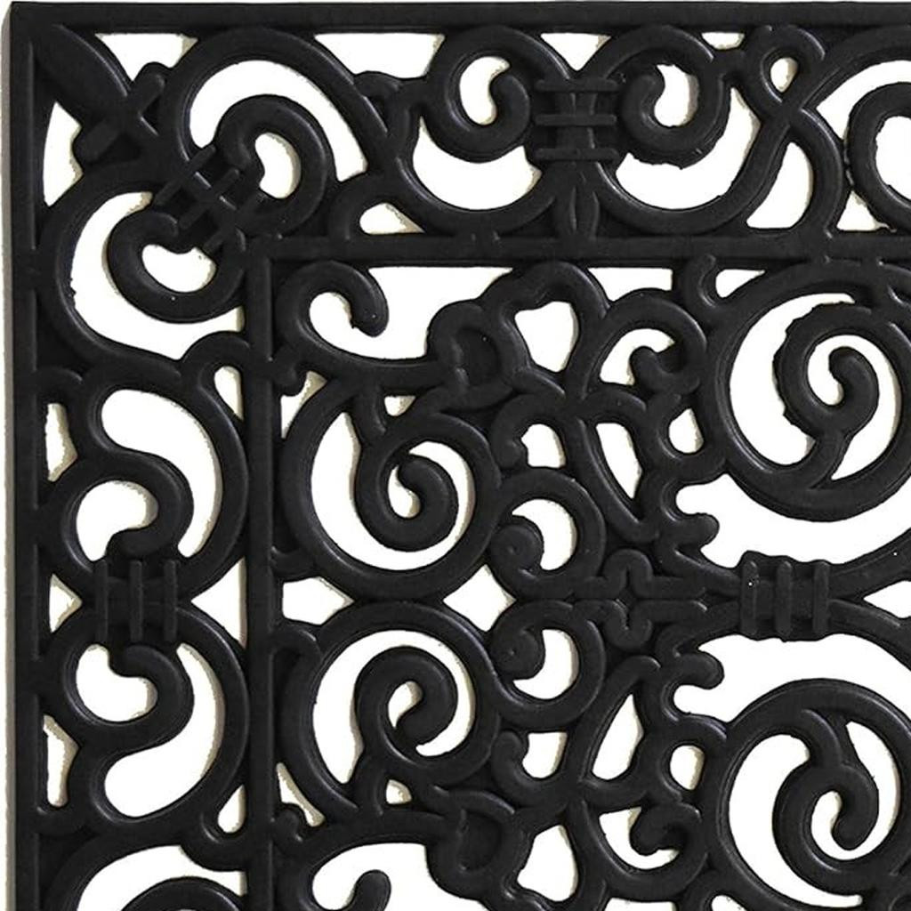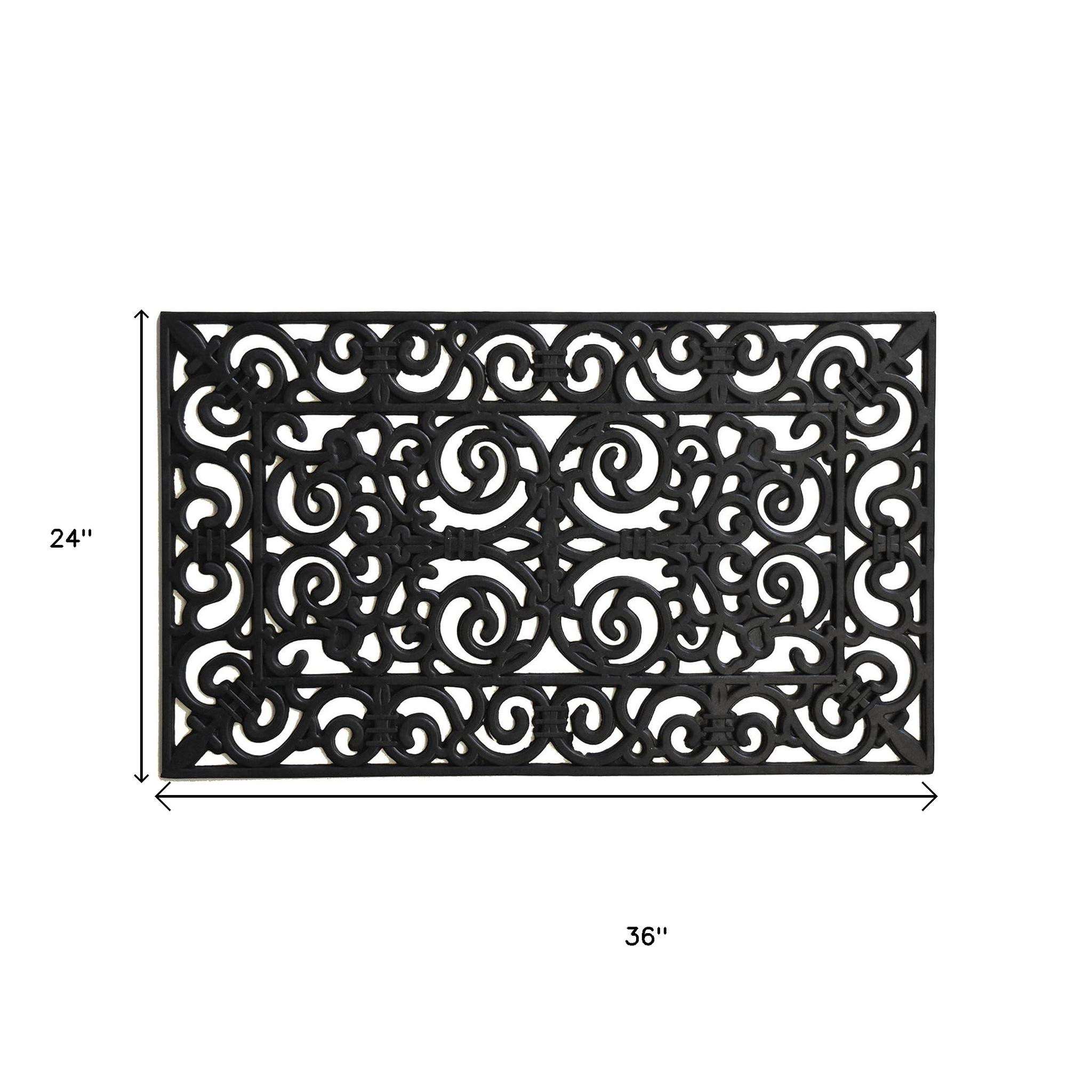 Ready to withstand heavy foot traffic, this 24-inch x 36-inch black scrollwork outdoor rubber door mat is an ideal option for the front door or entrance way of your home or business. Crafted from rubber, this mat is not only functional but is a visually appealing accessory to welcome people to your home or business. Add this decorative mat to create a practical yet inviting welcome to all who enter. 24-inch h x 36-inch w x 0.4-inch d.