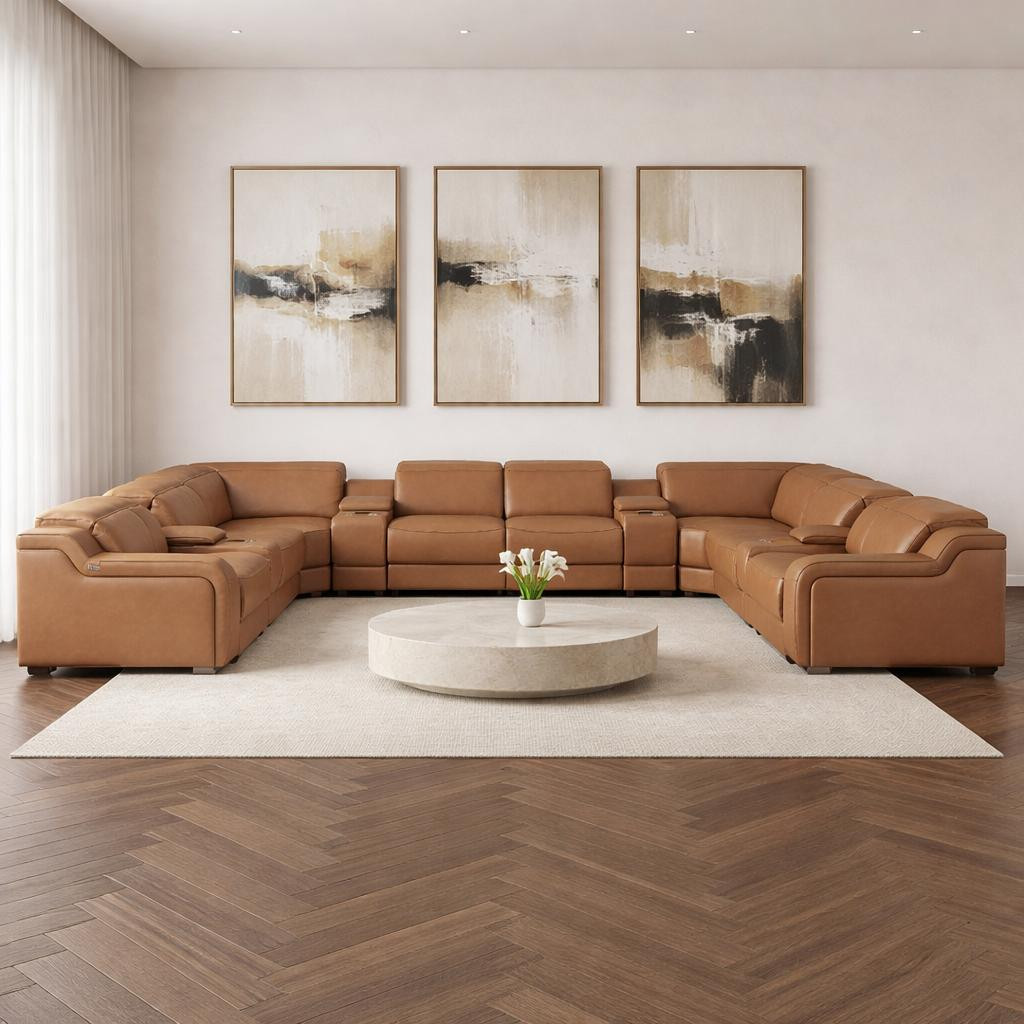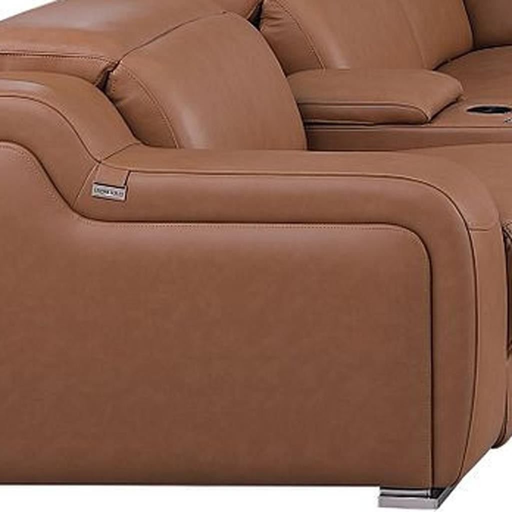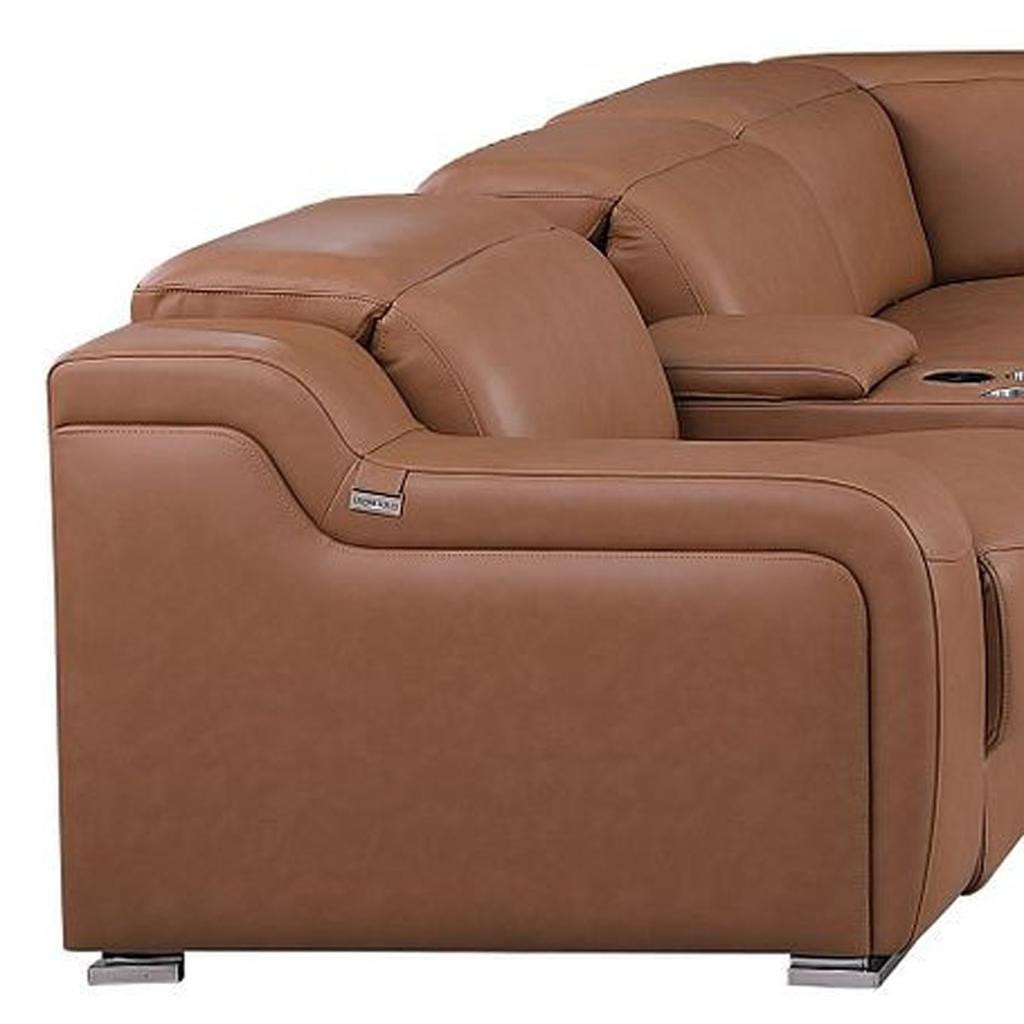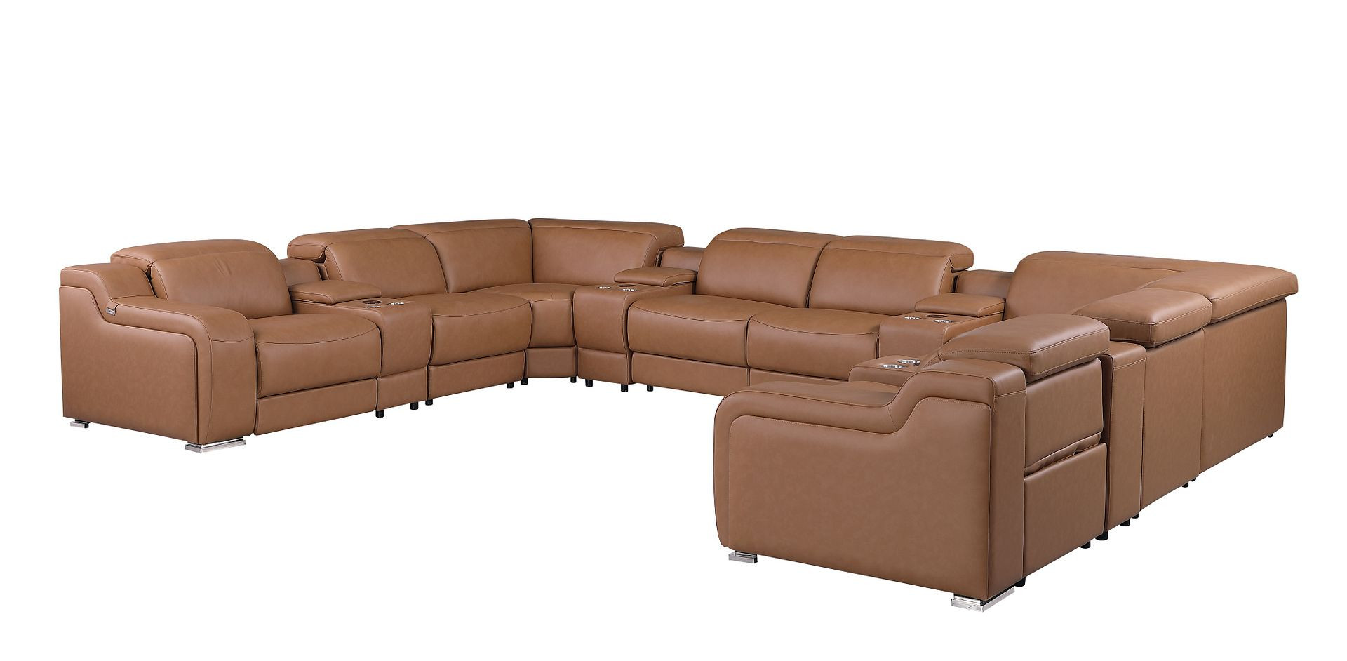 Take your relaxation to the next level with this super soft and comfortable chestnut italian leather power reclining u shaped twelve piece corner sectional with console. The high-end premium leather used makes your lounging luxuriously comfortable and adds an elegant appeal to your space. Solid colors give you lots of decorative options and are easy to work into your decor scheme. Square arms offer a comfy place to rest. For the ultimate in relaxation, this sectional includes power - push button recline that turns it into a comfy lounge for sleeping or resting. Silver metal legs effortlessly elevate the room and add a touch of contemporary design. A great showpiece for your room, this sectional is a must have. 39-inch h x 174-inch w x 126-inch d.