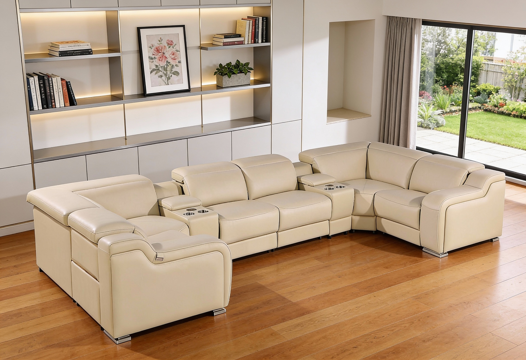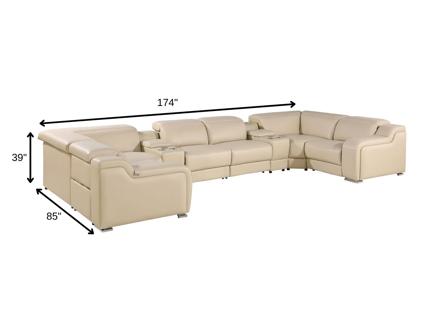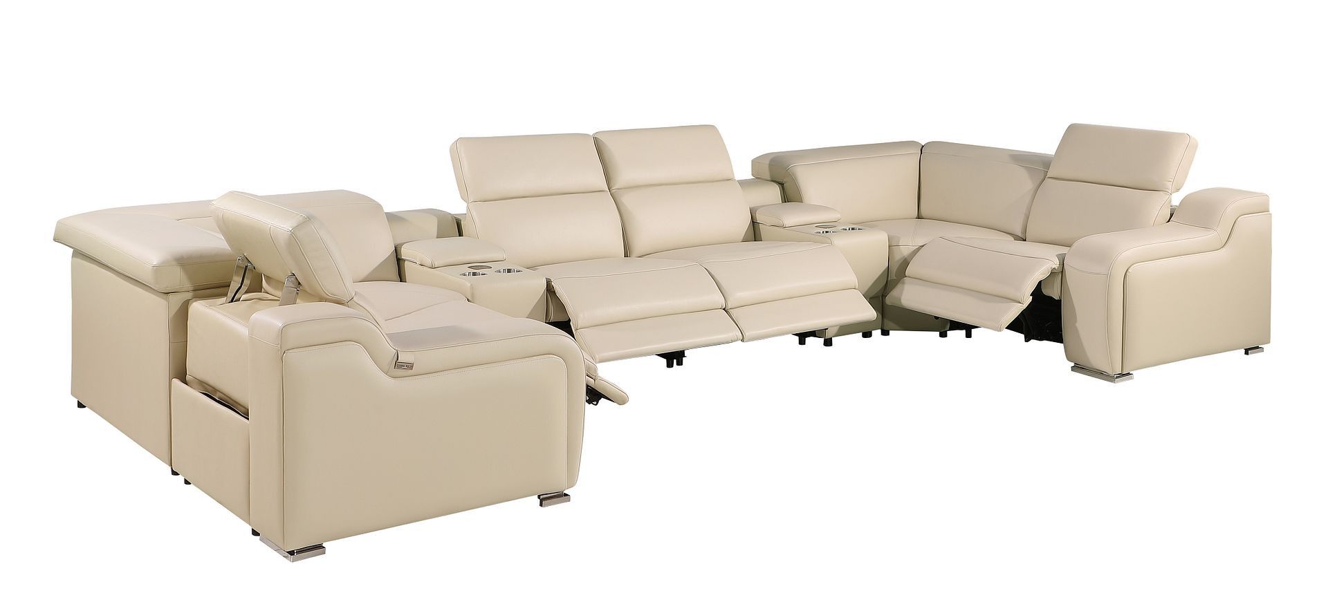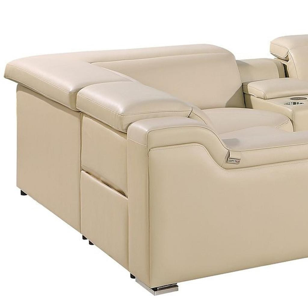 Made of the highest quality, supple leather, this beige Italian leather power reclining u shaped eight piece corner sectional with console will be the star of your space. The high-grade premium leather used makes your lounging luxuriously comfortable and adds an elegant appeal to your space. Solid colors give you lots of decorative options and are easy to work into your decor scheme. Square arms offer a comfy place to rest. Power - push button recline allows you to truly rest, lounge and even sleep comfortably. Silver metal legs effortlessly elevate the room and add a touch of contemporary design. Great for everyday lounging and for entertaining, sectionals are an ideal way to seat multiple people. 39.00-inch h x 174.00-inch w x 85.00-inch d.