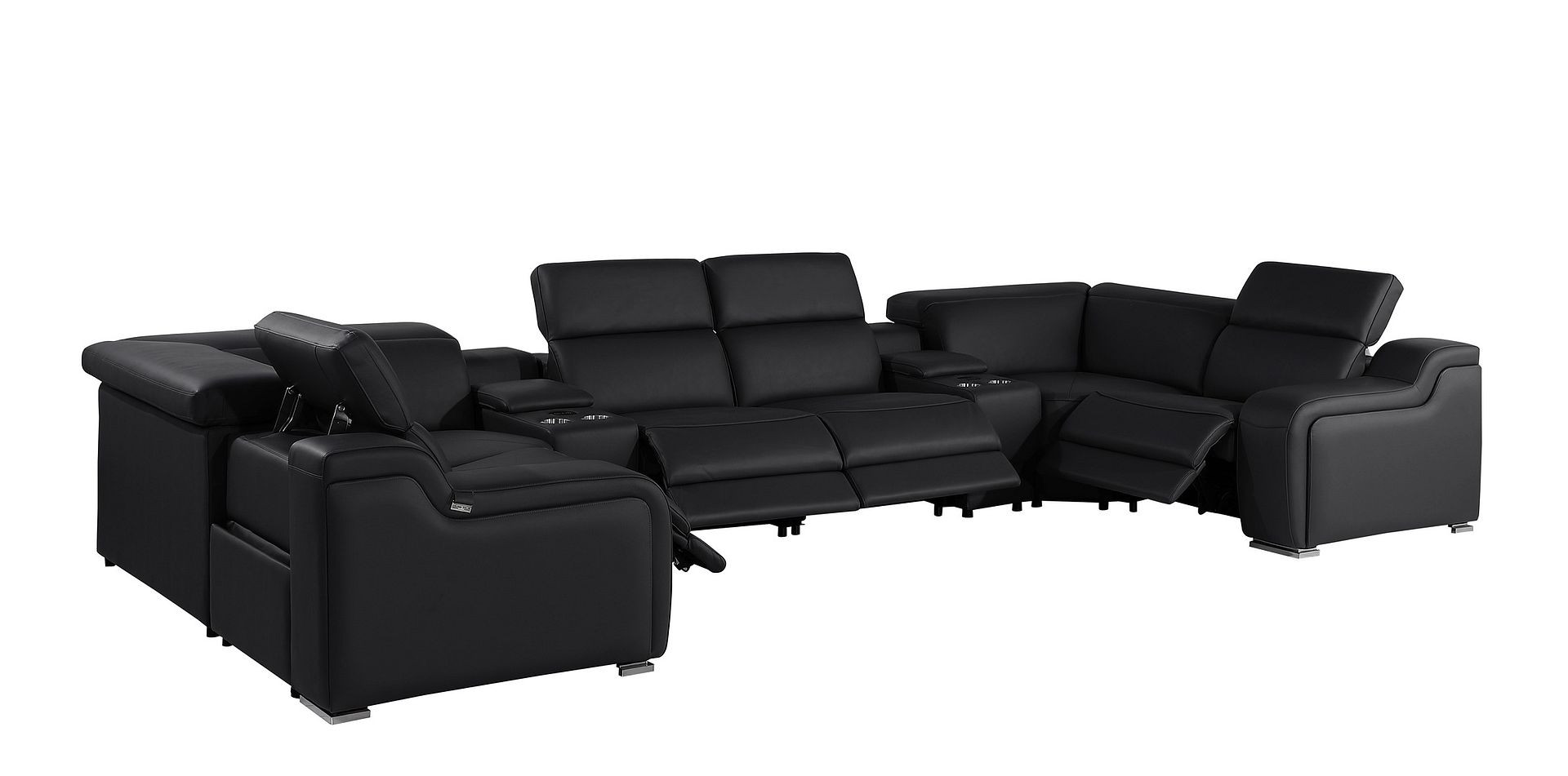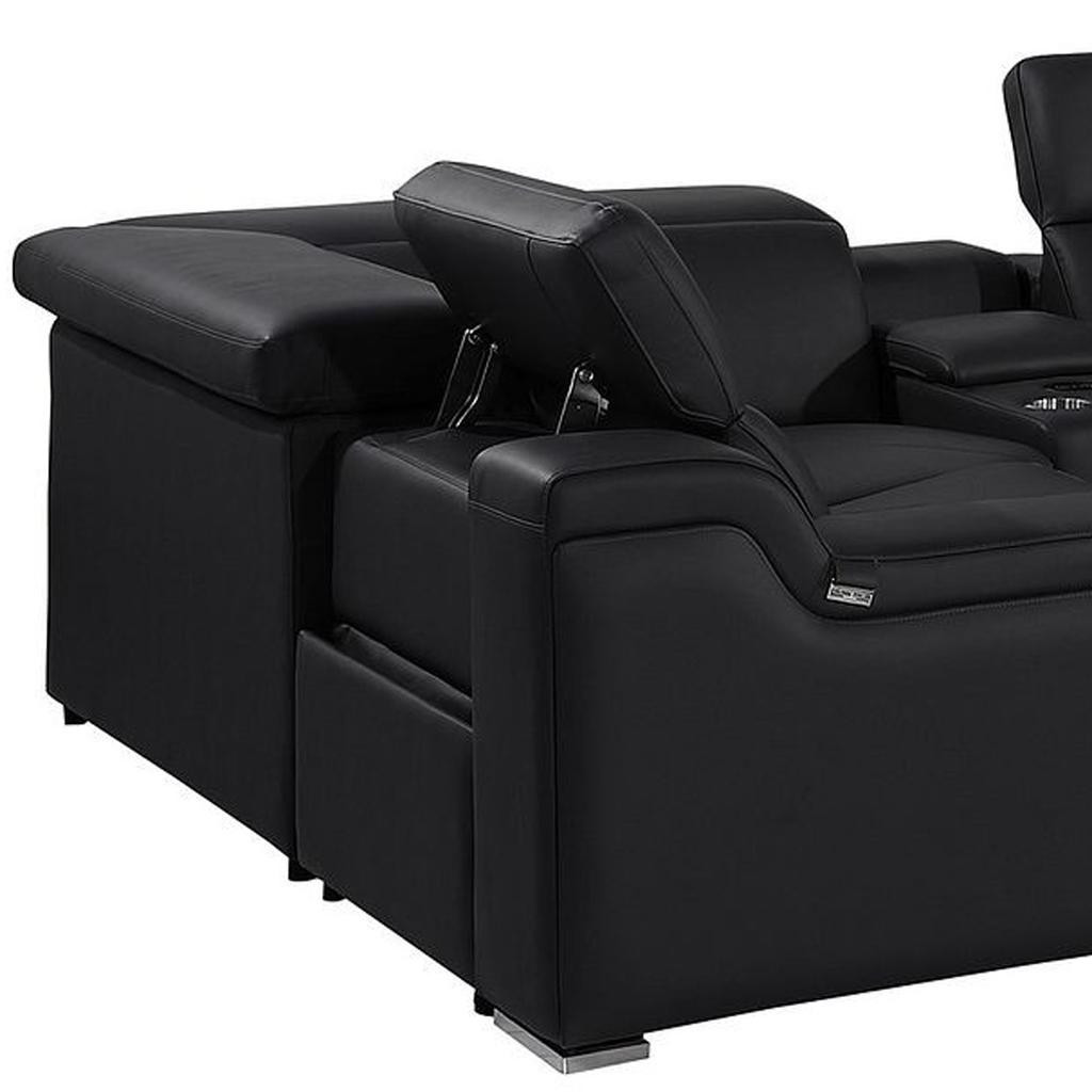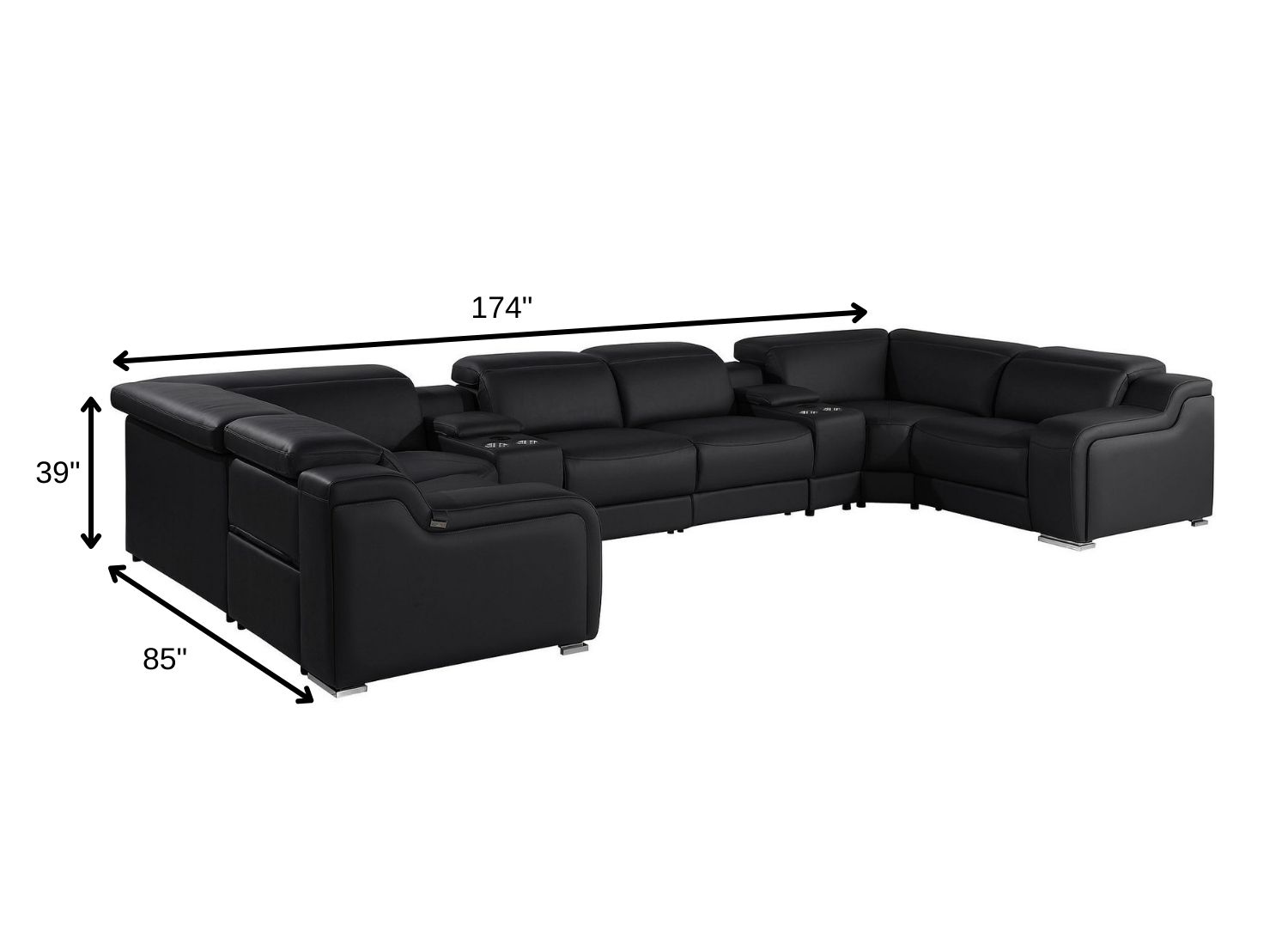 Take your relaxation to the next level with this super soft and comfortable black italian leather power reclining u shaped eight piece corner sectional with console. The high-end premium leather used makes your lounging luxuriously comfortable and adds an elegant appeal to your space. Solid colors give you lots of decorative options and are easy to work into your decor scheme. Square arms offer a comfy place to rest. For the ultimate in relaxation, this sectional includes power - push button recline that turns it into a comfy lounge for sleeping or resting. Silver metal legs effortlessly elevate the room and add a touch of contemporary design. Great for everyday lounging and for entertaining, sectionals are an ideal way to seat multiple people. 39.00-inch h x 174.00-inch w x 85.00-inch d.